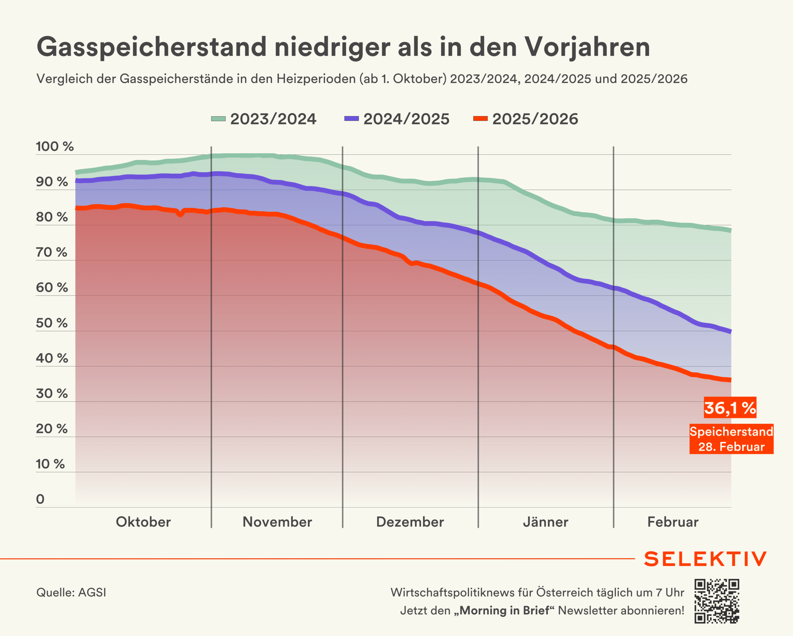 Die Speicherstände sind niedrig. In Österreich muss aber das Volumen für die geschützten Kunden auf 30 Tage vorgehalten werden. Auch haben wir in Österreich noch die strategische Gasreserve von 20 TWh, auf die zurückgegriffen werden kann, wenn alle Stricke reißen sollten. Österreich hat somit eine adäquate Versorgungssicherheit. Das ist in Deutschland nicht der Fall. Dort ist bis vor wenigen Tagen der Gasspeicherstand täglich um etwa 1 TWh gefallen und nur das warme Wetter hat diesen Trend nun gestoppt und Deutschland vor einer Gasmangellage bewahrt.