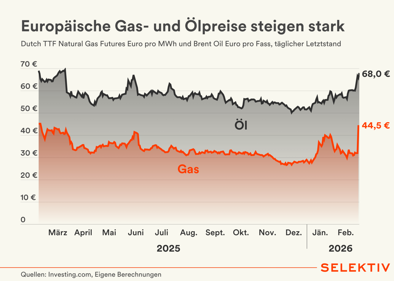 Bei LNG fällt mit Katar einer der drei großen globalen Exporteure weg, daher wird es jetzt mehr Nachfrage für amerikanisches LNG geben – und das treibt den Preis auch für Europa. Daher ist der TTF Börsenpreis für Erdgas übers Wochenende von 30 Euro/MWh bereits auf bis zu über 48 Euro/MWh gestiegen.