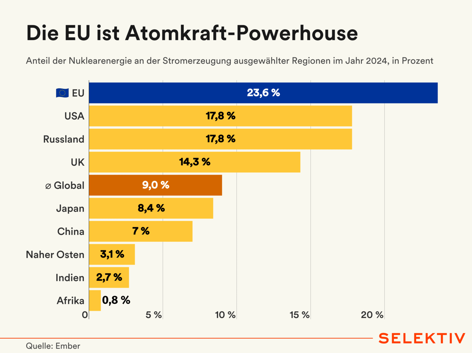 Im Jahr 2024 erzeugte die EU 23,6 % ihres Stroms durch Nuklearenergie – deutlich über dem globalen Durchschnitt von 9,0 %. Den größten Anteil am EU-Atomstrom liefert Frankreich (2023: 55 %). Zu den weltweit führenden Atomstromproduzenten gehören außerdem die USA und Russland (je 17,8 %) sowie das Vereinigte Königreich (14,3 %). Fossile Brennstoffe wie Gas und Kohle machten im vergangenen Jahr 29 % der EU-Stromerzeugung aus – der globale Durchschnitt liegt hier bei 59 %.