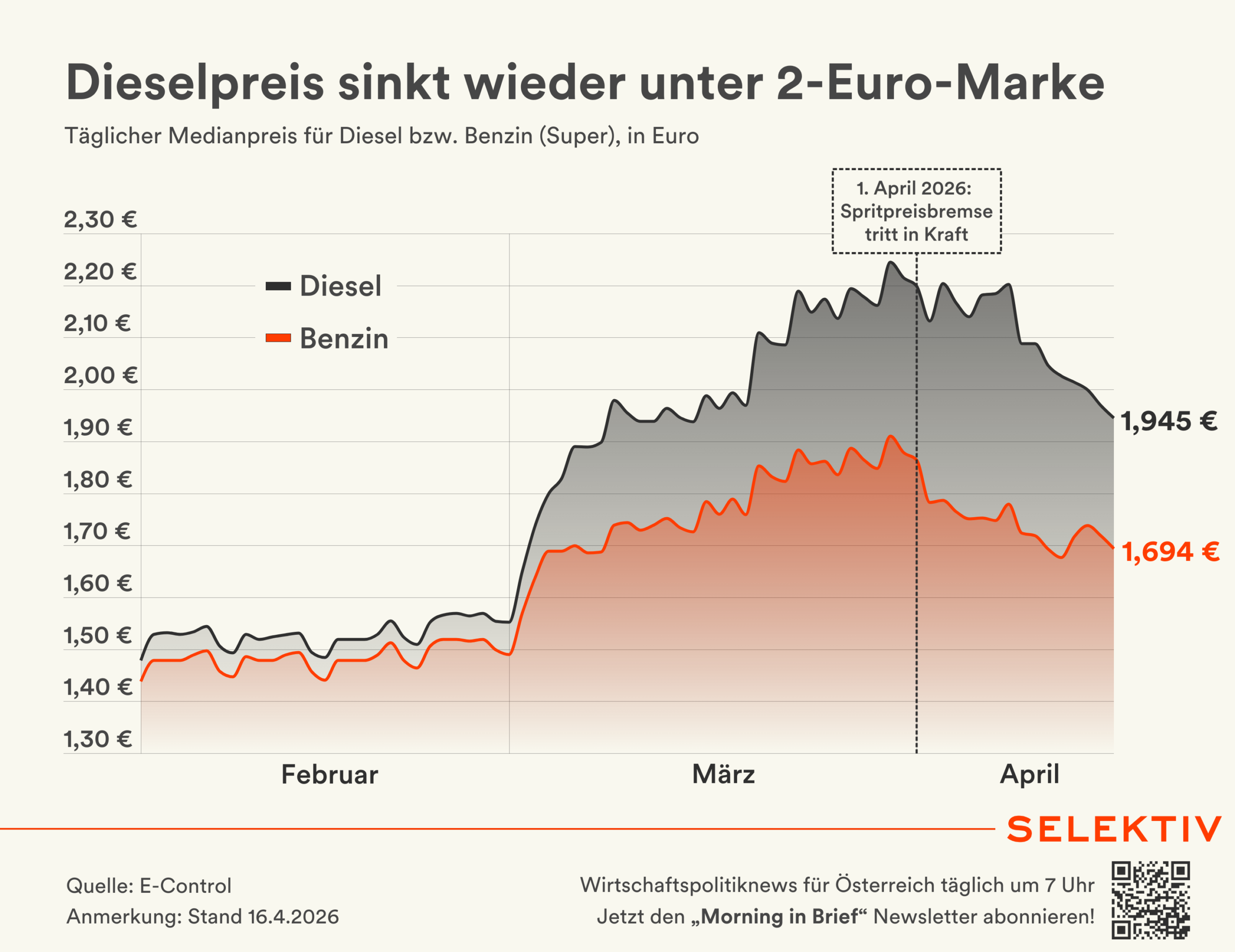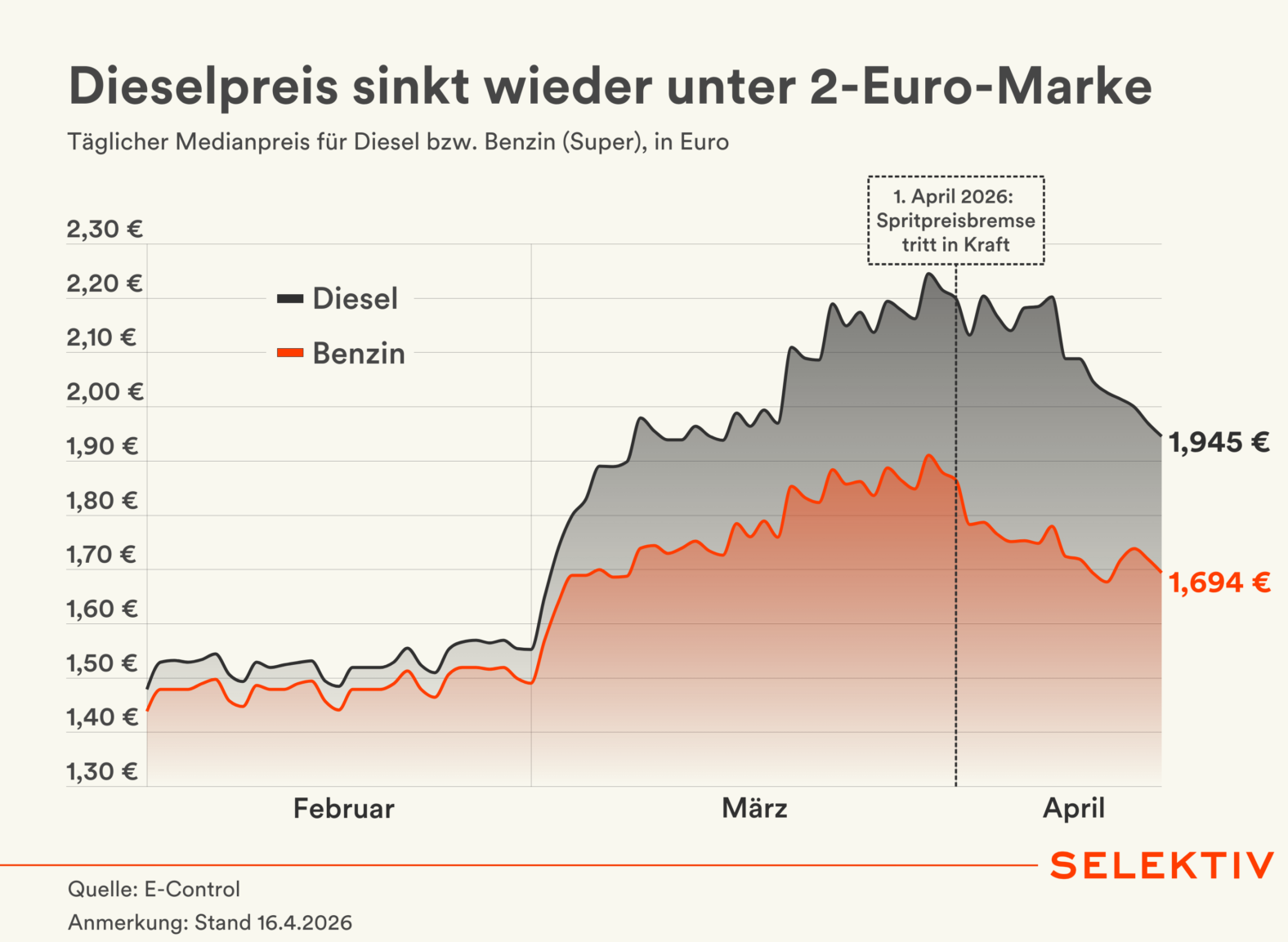 Die mittleren Treibstoffpreise lagen am 16. April bei 1,945 Euro für Diesel und 1,694 Euro für Benzin. Seit dieser Woche liegt der Dieselpreis wieder unter der 2-Euro-Marke. Ende März erreichte der Preis für einen Liter Diesel mit 2,245 Euro seinen bisherigen Höchststand. Seit Inkrafttreten der Spritpreisbremse ist der Dieselpreis um 11,5 % gefallen, der Benzinpreis um 9,1 %.