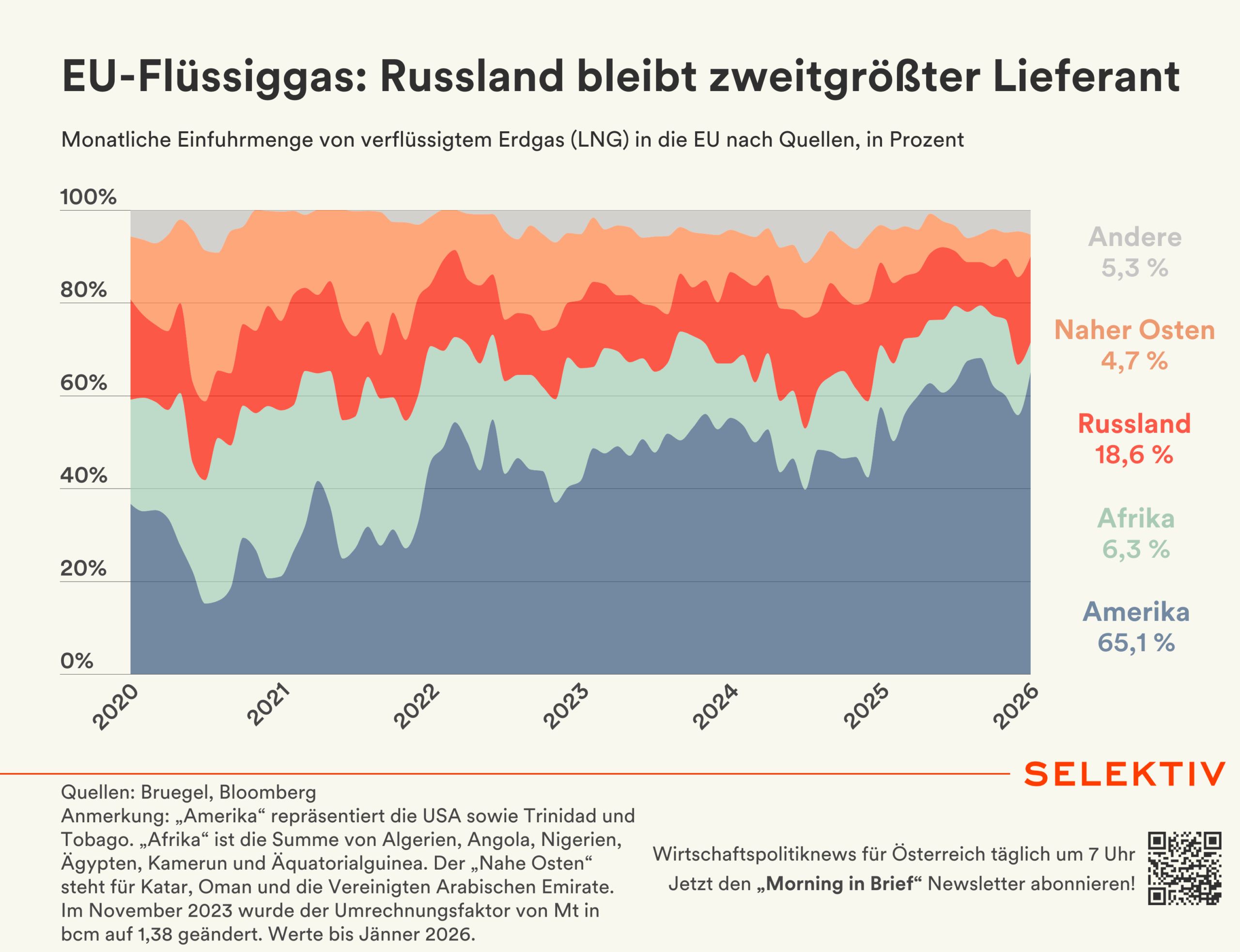 Im Vorjahr hat die EU verflüssigtes Erdgas (LNG) aus Russland im Wert von 7,4 Mrd. Euro importiert, ein Rückgang von 3 % im Vergleich zu 2024. Auch wenn auf die USA mittlerweile knapp zwei Drittel der LNG-Importe entfallen, bleibt Russland für die EU einer der wichtigsten Flüssiggas-Lieferanten. Der Anteil der LNG-Importe aus Afrika und dem Nahen Osten ging dagegen deutlich zurück. Mit Anfang 2027 wird der Import von russischem LNG in die EU vollständig verboten.