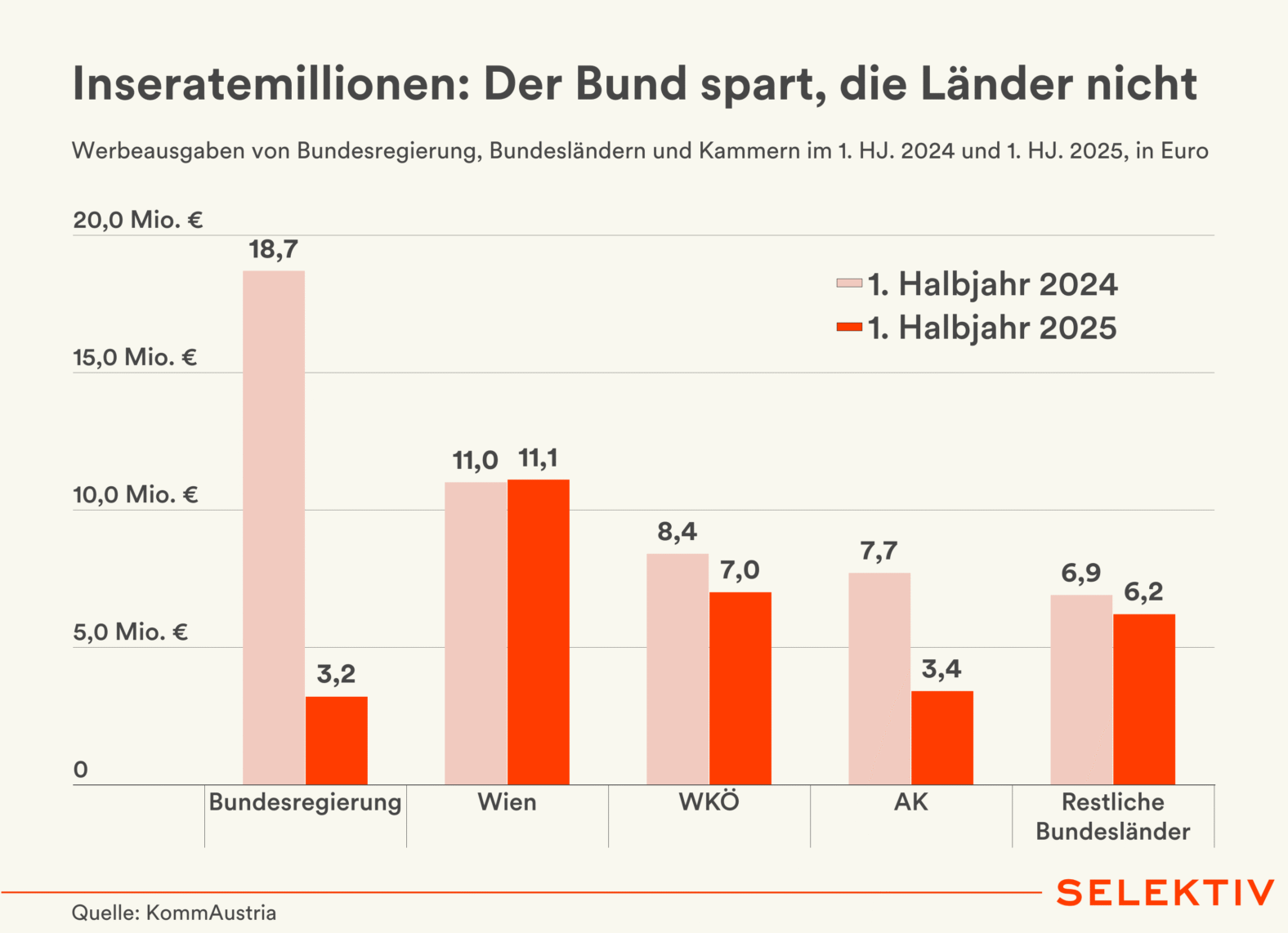 Im 1. Halbjahr 2025 sanken die Werbeausgaben der Bundesregierung im Vergleich zum Vorjahreszeitraum um 15,5 Mio. Euro. In den Bundesländern betrug der Rückgang hingegen nur etwa 600.000 Euro. Wien, das Bundesland mit dem höchsten Werbeetat, verzeichnete einen leichten Anstieg von 100.000 Euro. Die Arbeiterkammer (AK) reduzierte ihre Werbeausgaben von 7,7 Mio. Euro auf 3,4 Mio. Euro, während die Wirtschaftskammer Österreich (WKÖ) einen Rückgang um 1,4 Mio. Euro verzeichnete.