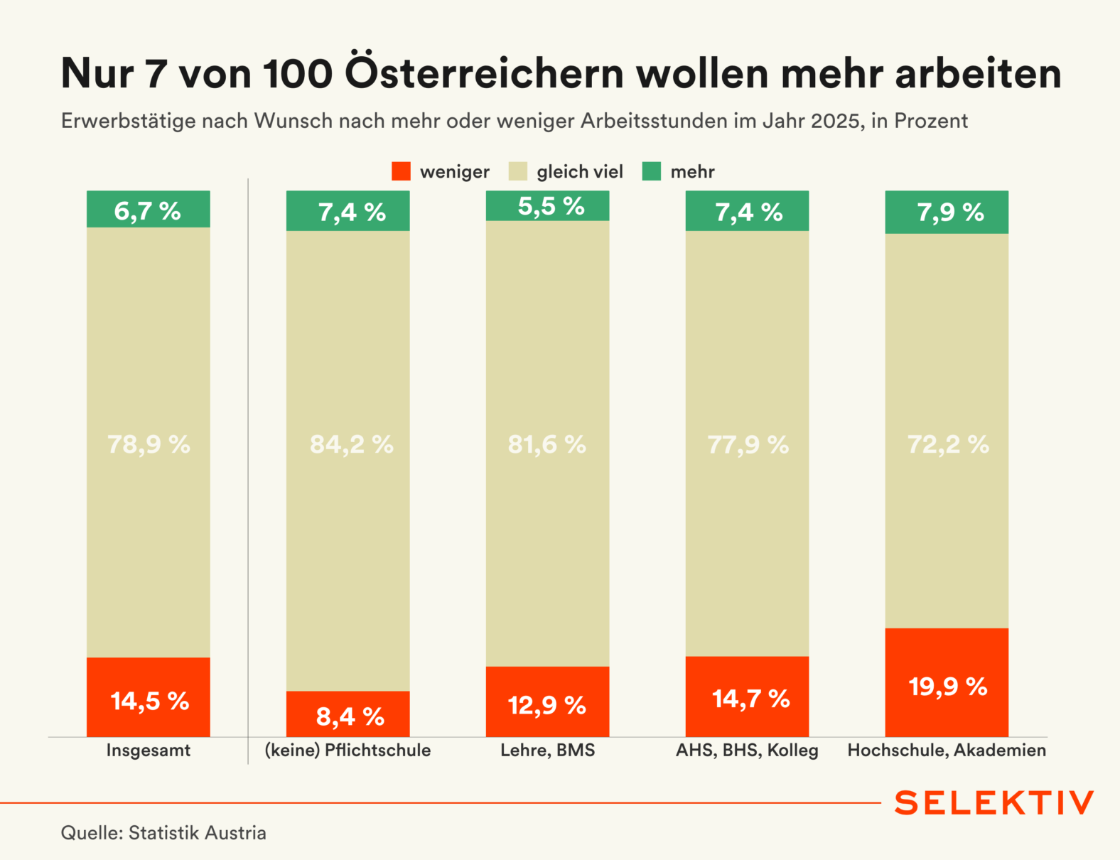 Rund 80 % der Erwerbstätigen in Österreich sind mit ihrer Arbeitszeit zufrieden. 14,5 % wollen weniger Arbeiten, auch wenn damit finanzielle Einbußen verbunden wären. Nur 6,7 % würden gerne mehr arbeiten. Je höher der Bildungsabschluss, desto häufiger wird der Wunsch nach Arbeitszeitreduktion geäußert. Sind es bei Personen mit maximal Pflichtschulabschluss nur 8,4 %, die gerne weniger arbeiten wollen würden, so sind es bei Akademikern bereits 20 %. „Viele Menschen wünschen sich eine bessere Work-Life-Balance. Mittelfristig ist kein massiver Wunsch nach mehr Arbeitsstunden zu erwarten“, so Statistik-Austria-Generaldirektorin Manuela Lenk.