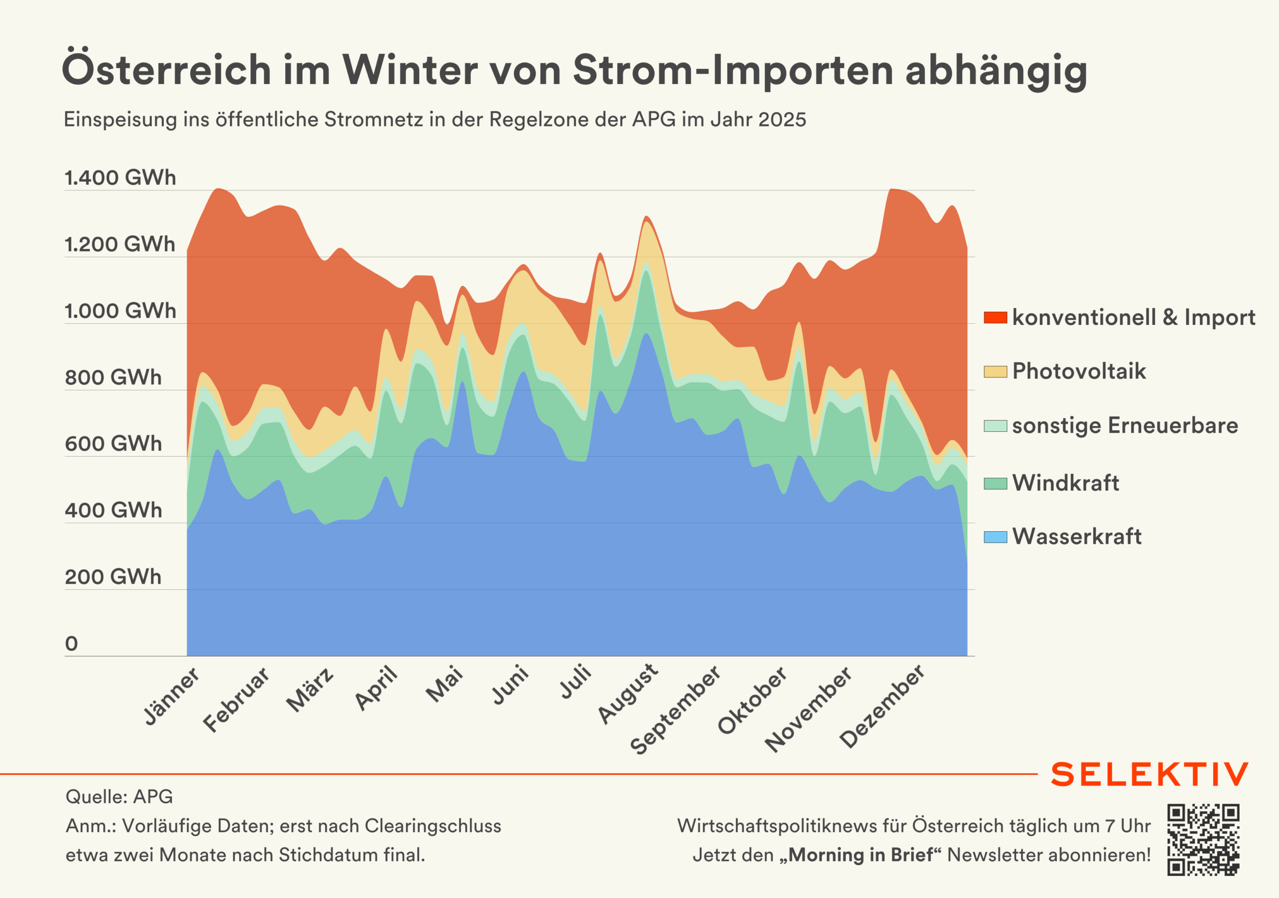 Während Österreich im Jahr 2024 aufgrund starker erneuerbarer Stromproduktion zum Stromexportland wurde, musste 2025 wieder Strom importiert werden. Vor allem in den Wintermonaten ist das österreichische Stromsystem auf Gaskraftwerke und Importe angewiesen, so konnten im Dezember 2025 nur 51,7 % des Stromverbrauchs mit Erneuerbaren gedeckt werden. Um saisonale Schwankungen in der Stromproduktion langfristig ausgleichen zu können, muss Österreich laut Berechnungen der E-Control seine Stromspeicherkapazität bis zum Jahr 2040 auf rund 18 Gigawatt verdreifachen. Bei den Strompreisen erwartet die E-Control für 2027 einen Großhandelspreis von rund 90 Euro/MWh, was einen Energiepreis für Haushaltskunden von 10-11 Cent/kWh (netto) ergibt. Höhere CO2-Bepreisung, teures LNG und nötige Investitionen in Kraftwerke und Leitungen würden eine Rückkehr zum Preisniveau vor der Krise verunmöglichen.