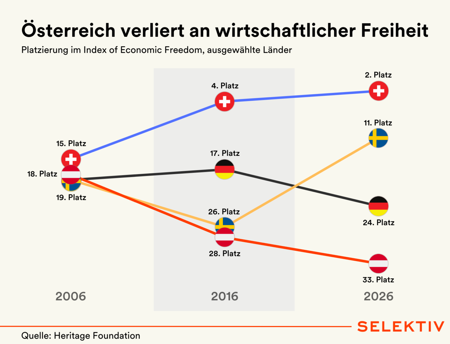 Österreich fällt im „Index of Economic Freedom“ der Heritage Foundation von Platz 18 (2006) über Platz 28 (2016) auf Platz 33 (2026) zurück. Im gleichen Zeitraum kann die Schweiz von Platz 15 (2006) auf den starken 2. Platz (2026) klettern. Schweden verbessert sich von Rang 19 (2006) auf Platz 11 (2026). Deutschland befindet sich wie Österreich auf einem Abwärtstrend und verlor seit 2016 (Rang 17) 7 Plätze (2026: Rang 24). Besonders schlecht schneidet Österreich in den Bereichen „Staatsausgaben“ und „Steuerlast“ ab.
