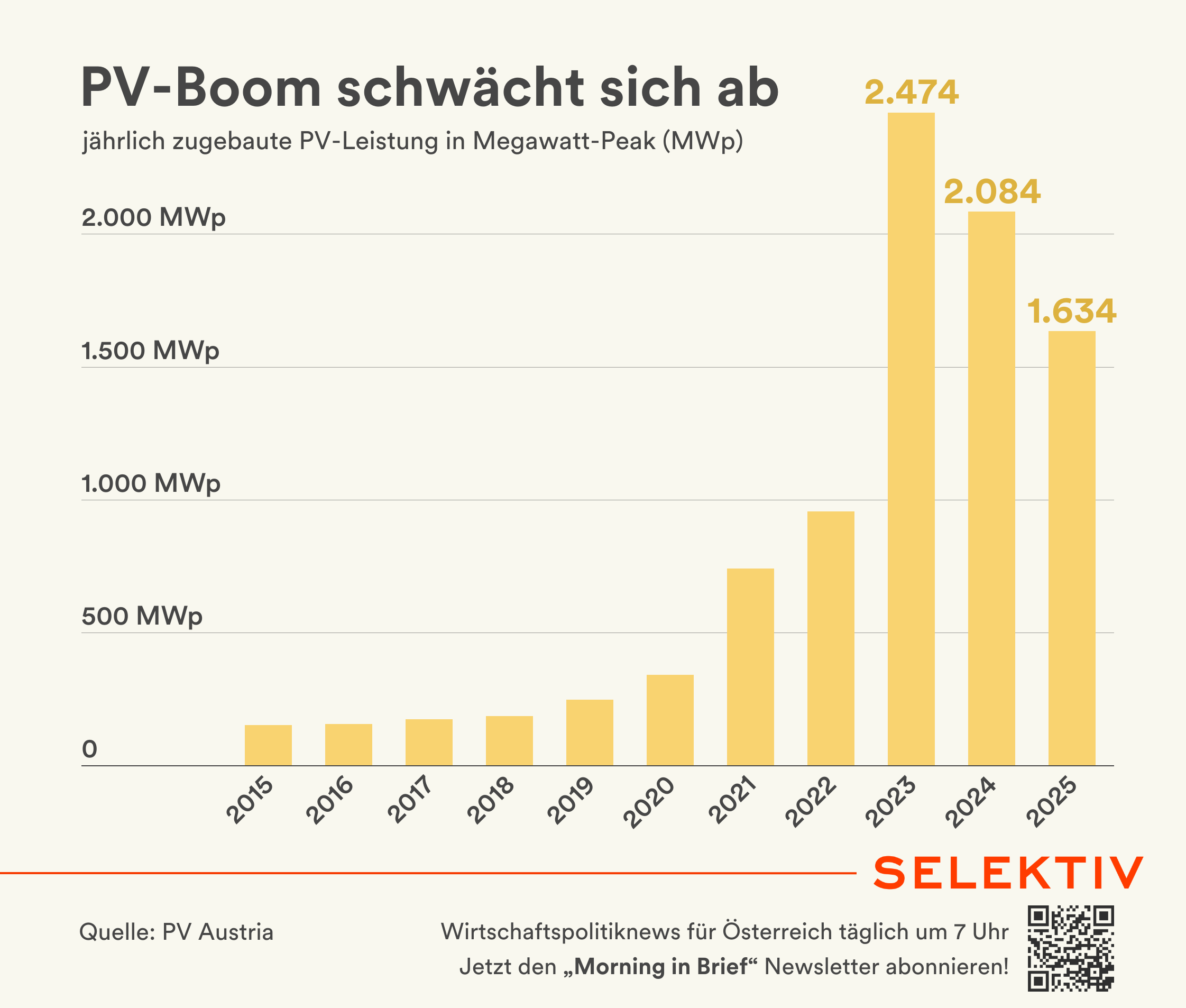 Der jährliche Ausbau von Photovoltaik ist im Vorjahr weiter zurückgegangen. Mit 1.634 Megawatt-Peak (MWp) ergibt sich 2025 ein Rückgang von einem Fünftel zum Jahr 2024, im Vergleich zum Rekordjahr 2023 war der Ausbau um ein Drittel niedriger. Laut Photovoltaic Austria bräuchte es jährlich einen Zubau von mindestens 2.000 MWp, um die im Österreichischen Netzinfrastrukturplan (ÖNIP) festgeschriebenen PV-Ausbauziele zu erreichen. Für das laufende Jahr erwartet PV Austria einen Ausbau auf dem Niveau des Vorjahres – „unterm Strich ist das um 20 bis 25 % zu wenig“, so PV-Austria-Geschäftsführerin Vera Immitzer.