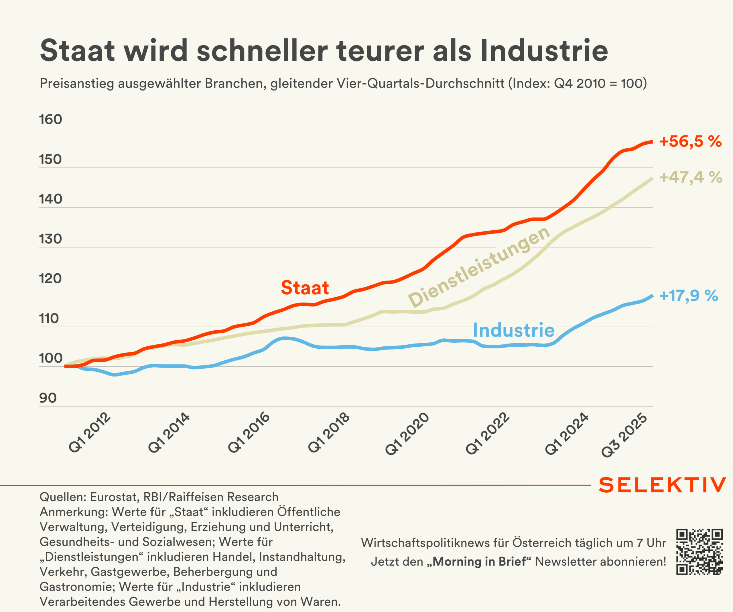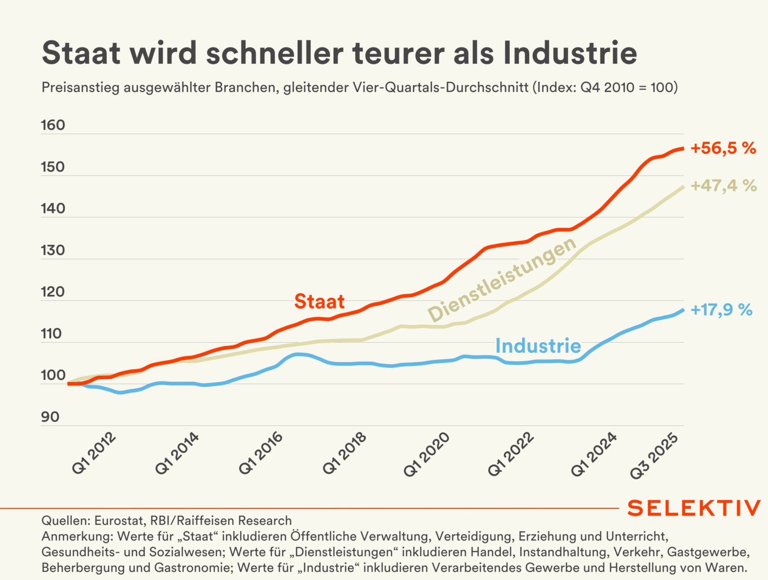 Die österreichische Industrie wirkt seit 2010 als wichtiger Preisdämpfer für die gesamte Wirtschaft. Während die Verbraucherpreise im Branchendurchschnitt um knapp 46 % gestiegen sind, legten die Preise in der Industrie nur um rund 18 % zu. Das liegt vor allem an deutlich höheren Produktivitätszuwächsen und am intensiven globalen Wettbewerb, der es den Unternehmen nur begrenzt erlaubt, Lohnkostensteigerungen an Konsumenten weiterzugeben. Industriepreise wurden dadurch bis zum Beginn der Energiepreiskrise stabil gehalten – im Gegensatz zu personalintensiven Dienstleistungsbranchen (+47,4 %) und dem staatsnahen Sektor (+56,5 %).