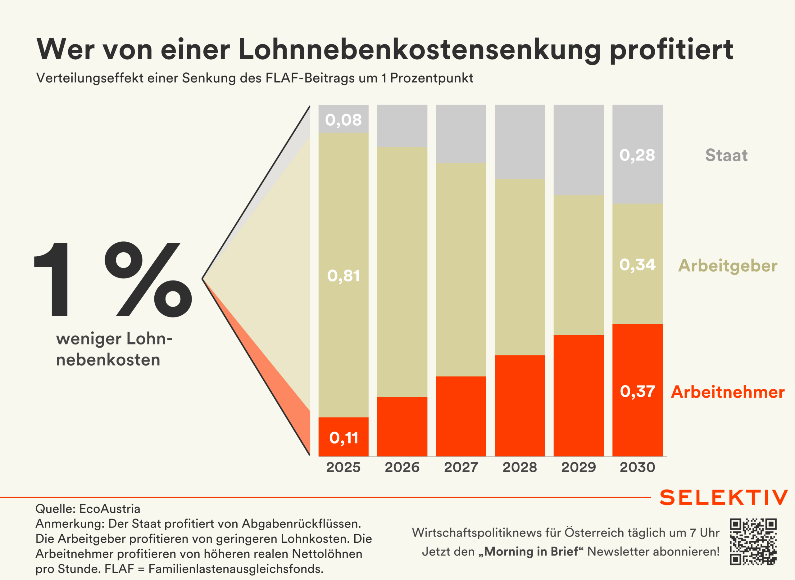 Laut einer EcoAustria-Studie würde eine Reduktion des FLAF-Beitrags um 1 Prozentpunkt mittelfristig die realen Nettolöhne um 0,37 Prozentpunkte steigern. Arbeitgeber profitieren von 0,34 Prozentpunkten geringeren Lohnkosten, und durch dynamische Rückflüsse (mehr Beschäftigung, höhere Abgaben) fließen 0,28 Prozentpunkte zurück an den Staat – die Maßnahme finanziert sich damit teilweise selbst. „Eine Reduktion der Lohnnebenkosten würde die Kosten der Unternehmen dämpfen, die Erwerbseinkommen stärken und wäre über die verbesserte Wettbewerbsfähigkeit ein Schritt zur Belebung der Wirtschaft“, so EcoAustria-Ökonom Johannes Berger. Im Regierungsprogramm ist eine Senkung der Lohnnebenkosten erst ab 2027 vorgesehen, Finanzstaatssekretärin Barbara Eibinger-Miedl (ÖVP) drängt jedoch gegenüber der Kronen Zeitung auf ein Vorziehen von Entlastungsschritten.