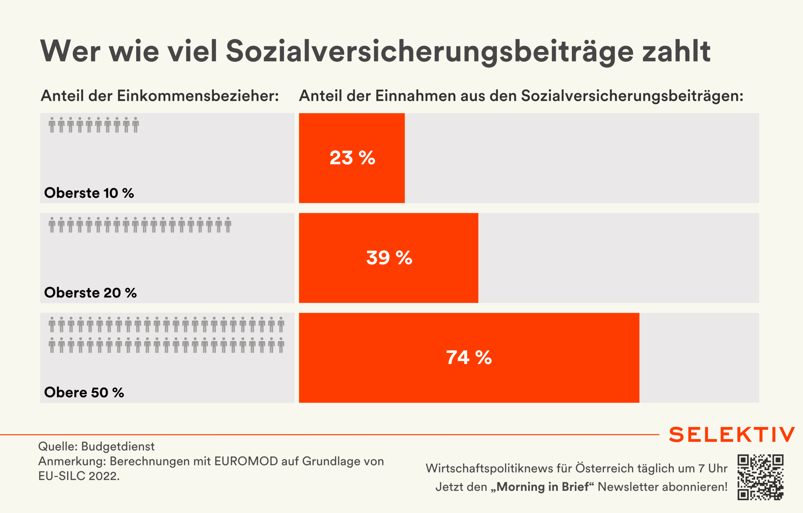 Im Jahr 2021 entfiel auf die obersten 10 % der Einkommensbezieher 23 % des Gesamtaufkommens aus den Sozialversicherungsbeiträgen. Auf die obersten 20 % kamen 39 % der Einnahmen, und die obere Hälfte der Einkommensbezieher trug insgesamt 74 % der Abgabenlast. Trotz Beitragsdeckelung durch die Höchstbeitragsgrundlage tragen vor allem Besserverdienende den Großteil zur Finanzierung der Sozialversicherungssysteme bei.
