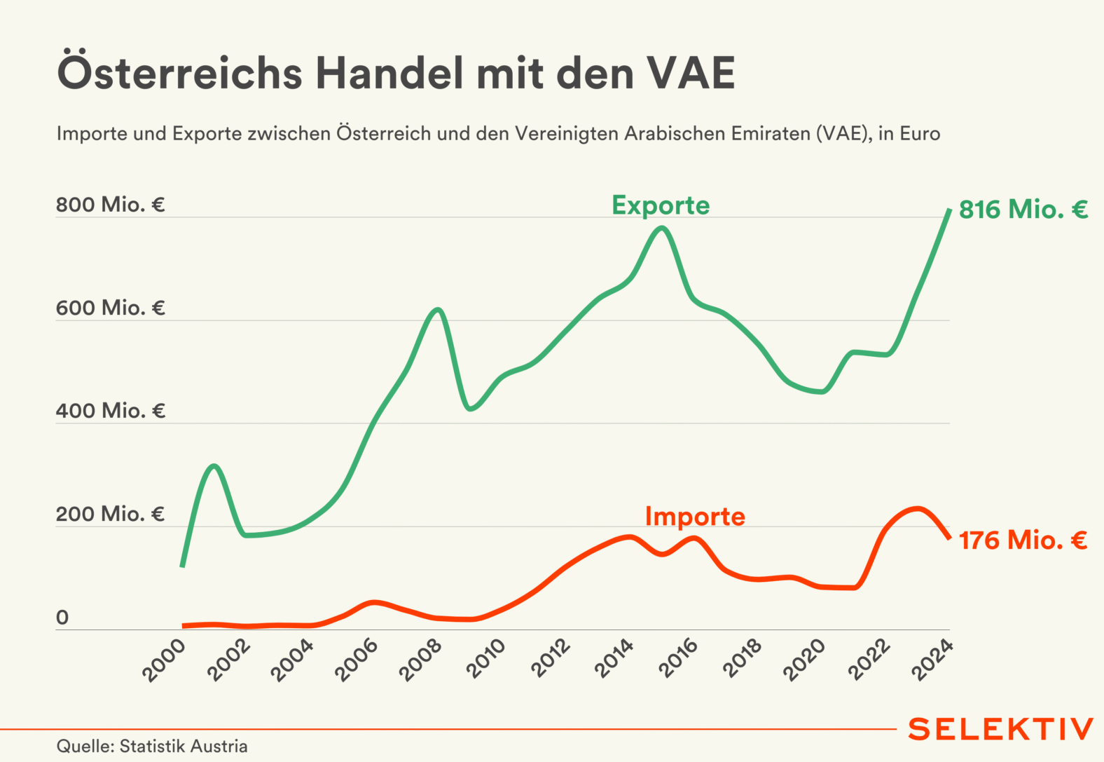 Hattmannsdorfer: Gerade Österreich ist ein Land, das kaum wie ein anderes vom Außenhandel lebt. Wir verdienen sechs von zehn Euro im Export und gerade in Zeiten, wo es zu enormen geoökonomischen Verwerfungen kommt, brauchen wir starke Partner in der Welt. Wir merken, dass die Exportwirtschaft derzeit massiv unter Druck ist – wegen des massiven Protektionismus der USA, wegen der massiven Subventionspolitik Chinas. In dieser Situation müssen wir schauen, wo wir neue, starke Allianzpartner finden und ich sehe so einen starken neuen Allianzpartner in den Vereinigten Arabischen Emiraten. Nicht nur, weil wir schon 200 Unternehmen vor Ort haben, sondern weil wir auch im abgelaufenen Jahr – und das ist in Zeiten wie diesen schon beachtlich – ein Plus von 24,2 Prozent bei unseren Exporten zu verzeichnen haben.