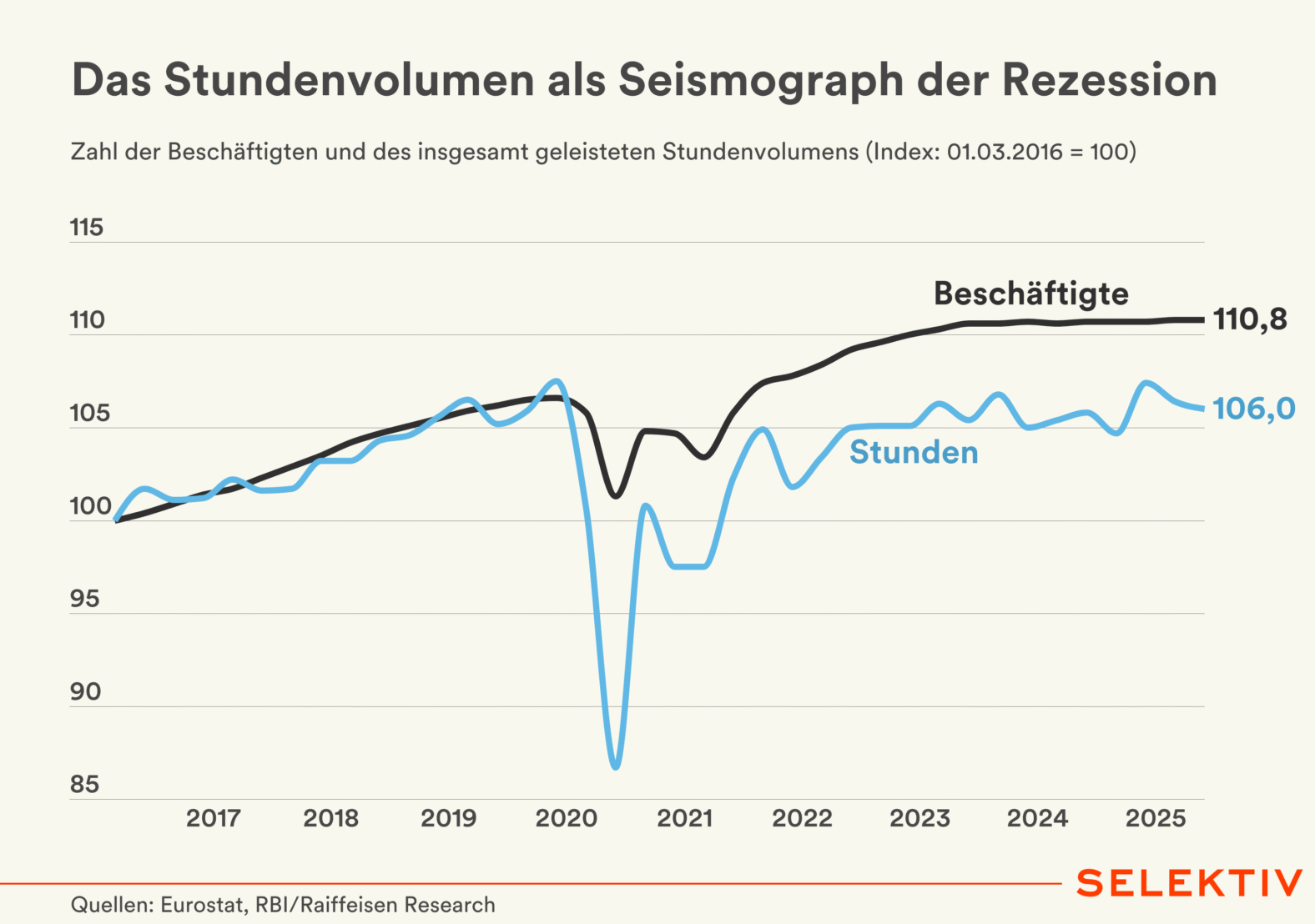Zweitens: Die Beschäftigung mag sich weiterhin auf oder nahe dem Rekord befinden, für die in Österreich geleisteten Arbeitsstunden gilt das nicht. Durch die Rezession wird weniger gearbeitet, das Stundenvolumen ist seit Ende 2019 um 1 % gesunken, die Beschäftigung aber um 4 % gestiegen. Wie viel in Österreich insgesamt gearbeitet wird (Stundenvolumen), ist derzeit also der eigentliche „Seismograph“ am Arbeitsmarkt für den konjunkturellen Gegenwind – und nicht wie viele in Österreich arbeiten.