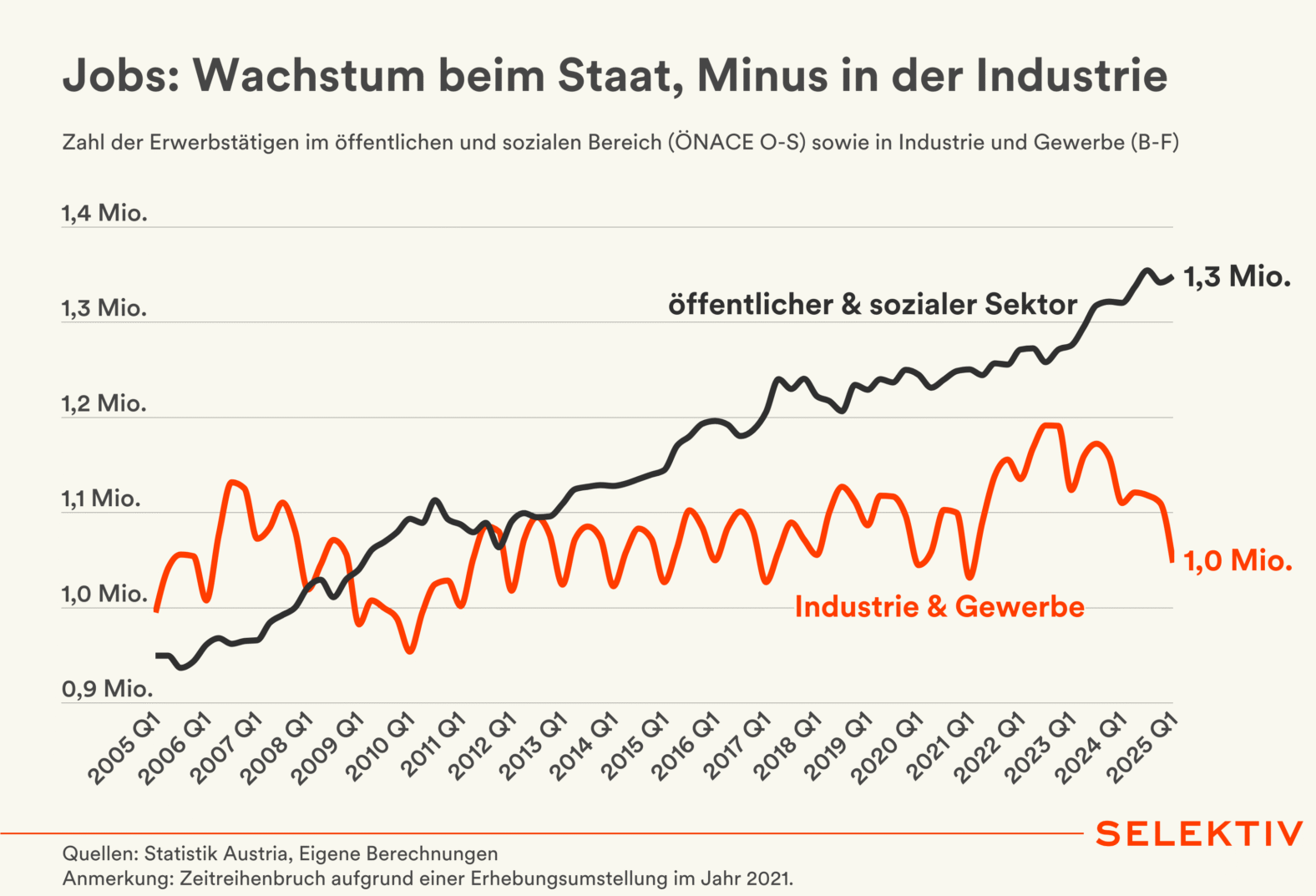 Gestern war Tag der Industrie und schon im Vorfeld lud die Industriellenvereinigung eine kleine Journalisten-Runde zum Austausch – das meiste, das dort gesprochen wurde, sollte nicht geschrieben oder gedruckt werden. In einem Punkt war IV-Präsident Georg Knill aber ganz klar: Der Staat bläht sich immer weiter auf, während die Industrie zurückgeht. Festgemacht hat er das an der Beschäftigung. Nach Rechnung der IV wuchs der Beamtenapparat inkl. Sozialbereich in den vergangenen zwei Jahren um rund 51.000 Menschen, während in der Industrie inkl. Bau 37.000 Arbeitsplätze verloren gegangen sind. Industrie und Gewerbe waren zuletzt 2012 größer als der öffentliche Sektor, seither geht die Schere auseinander. Jetzt braucht man nicht tief in die Analyse-Kiste der Wirtschaftsforscher greifen, um zu wissen, warum. Spannend wird, ob daraus die richtigen Schlüsse gezogen werden.