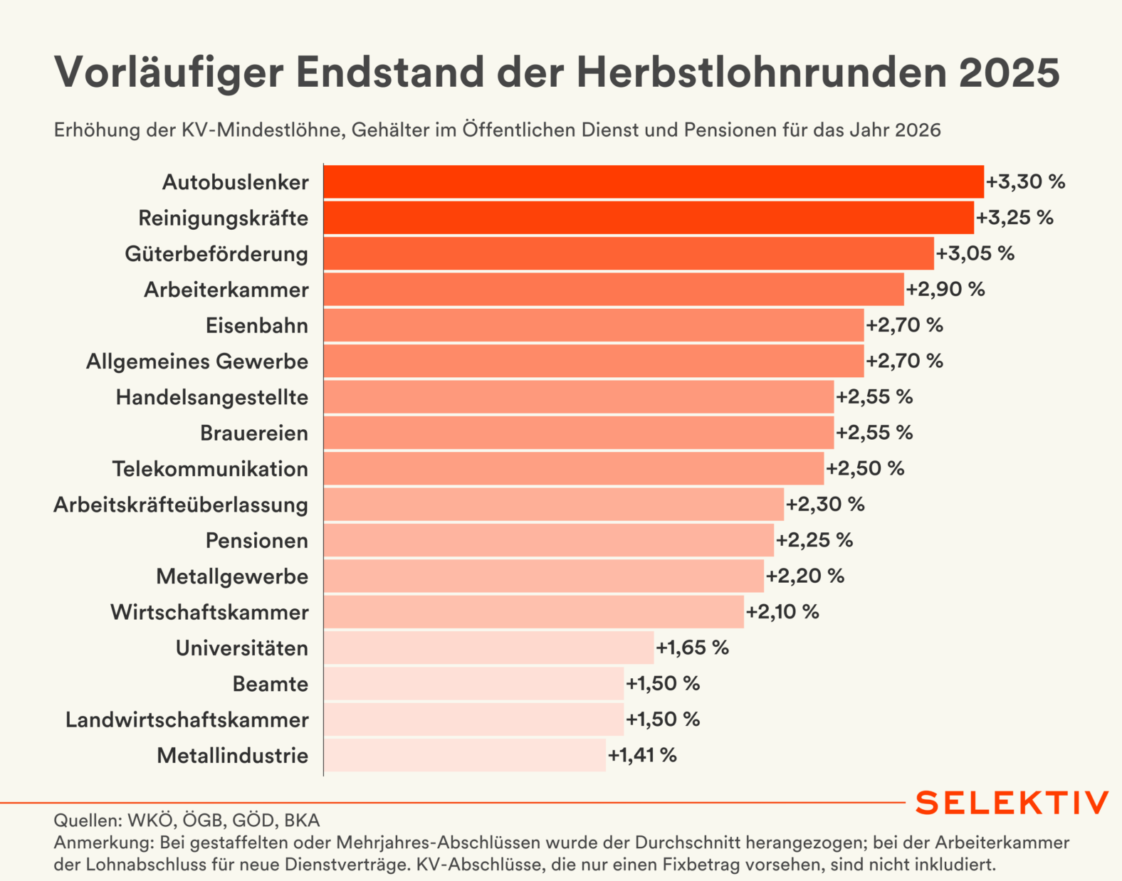 Näher am oberen Ende liegt in diesem Branchenvergleich auch die Arbeiterkammer mit einer Erhöhung der Gehälter um 2,90 %, während sich die Wirtschaftskammer nach den politischen Turbulenzen mittig mit 2,10 % einreiht. Am unteren Ende finden sich die Angestellten der Landwirtschaftskammern mit einem Plus von 1,50 %.