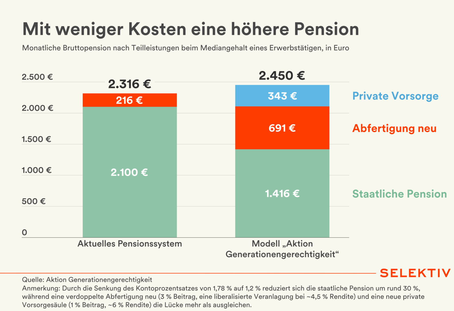 Zweitens, die ältere Generation, deren Pensionen in den letzten Jahren deutlich über einer Inflationsrate angehoben worden sind, in den letzten zwölf Jahren um fast 5 Prozent, muss diesen Betrag wieder zurückgeben. Damit kann man eine Verschiebung in die zweite Säule finanzieren. Das würde bedeuten, dass die Arbeitgeber statt 12,55 Prozent nur mehr 11 Prozent in das Umlagesystem einzahlen und dafür den Betrag für die Abfertigung neu von 1,5 Prozent auf 3 Prozent verdoppeln. Diese Abfertigung neu soll nicht mehr entnommen werden dürfen im Laufe des Lebens, sondern langfristig gewinnbringend veranlagt werden. So könnte man damit gut 25 bis 30 Prozent der Pensionen auf heutigem Niveau bezahlen.