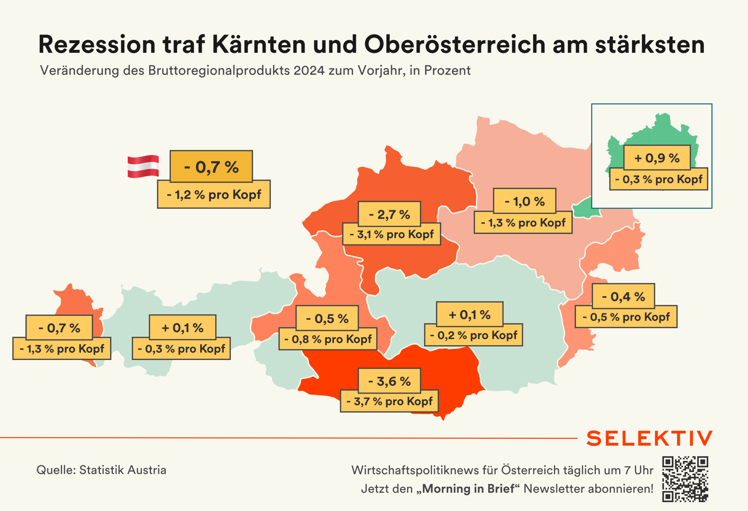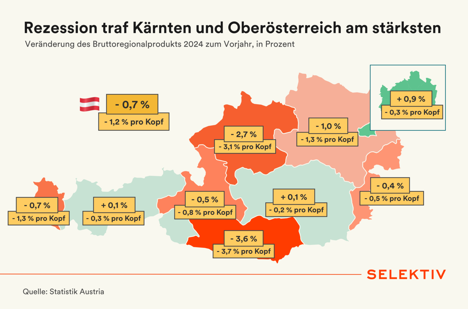 💡 Wirtschaft litt in Kärnten und OÖ am meisten. Die Rezession des Jahres 2024 traf die Bundesländer ganz unterschiedlich. Während Kärnten und Oberösterreich unter dem Rückgang der Industrieproduktion besonders litten, stagnierte die Wirtschaftsleistung in den meisten anderen Bundesländern. In Wien wuchs die Wirtschaft gesamt betrachtet am stärksten – getrieben durch Dienstleistungen, insbesondere in Finanz, IT und öffentlichem Sektor. Pro Kopf betrachtet schrumpfte die Wirtschaft jedoch in allen Bundesländern. [Quelle: Statistik Austria | Grafik von Sara Grasel]