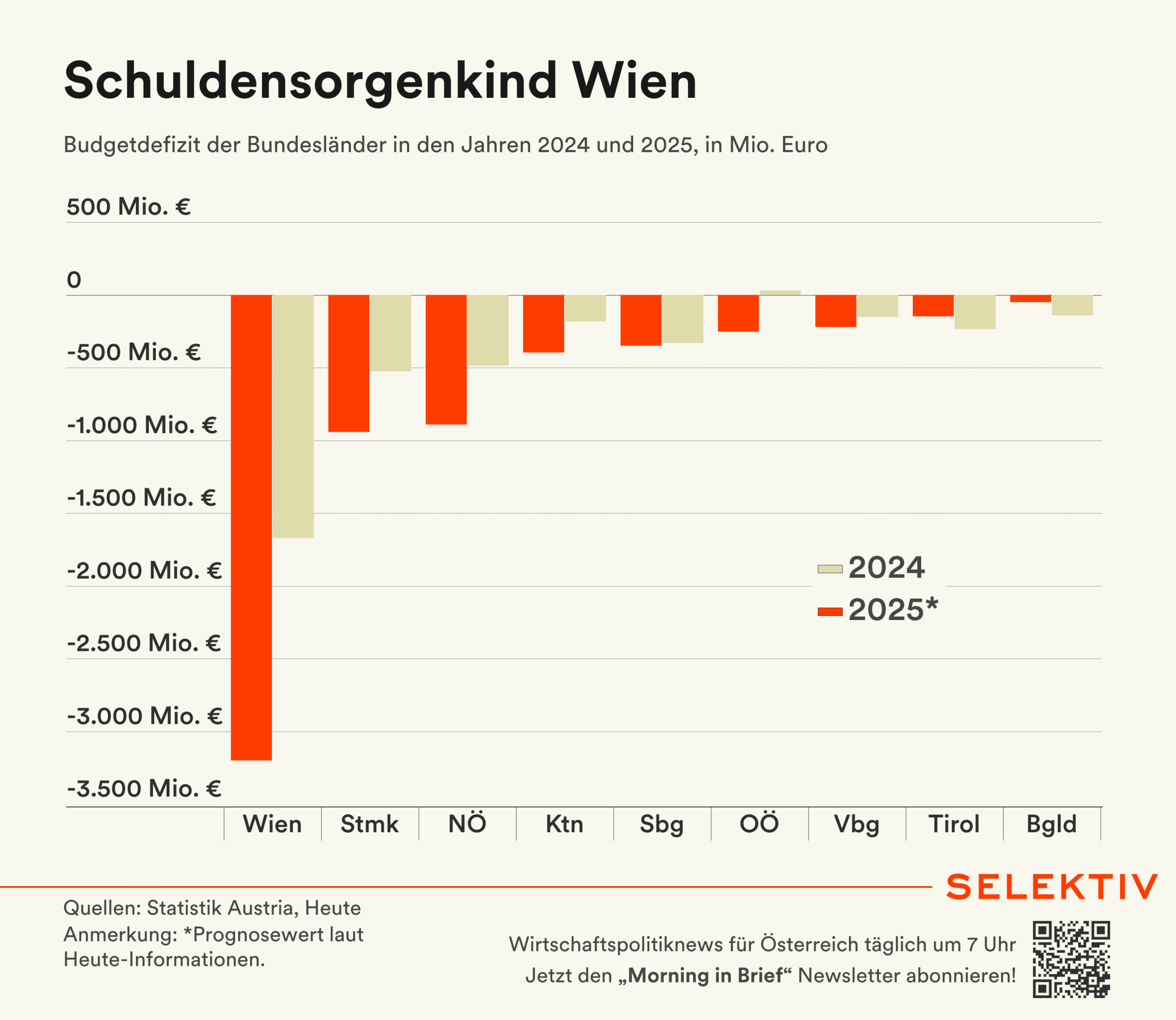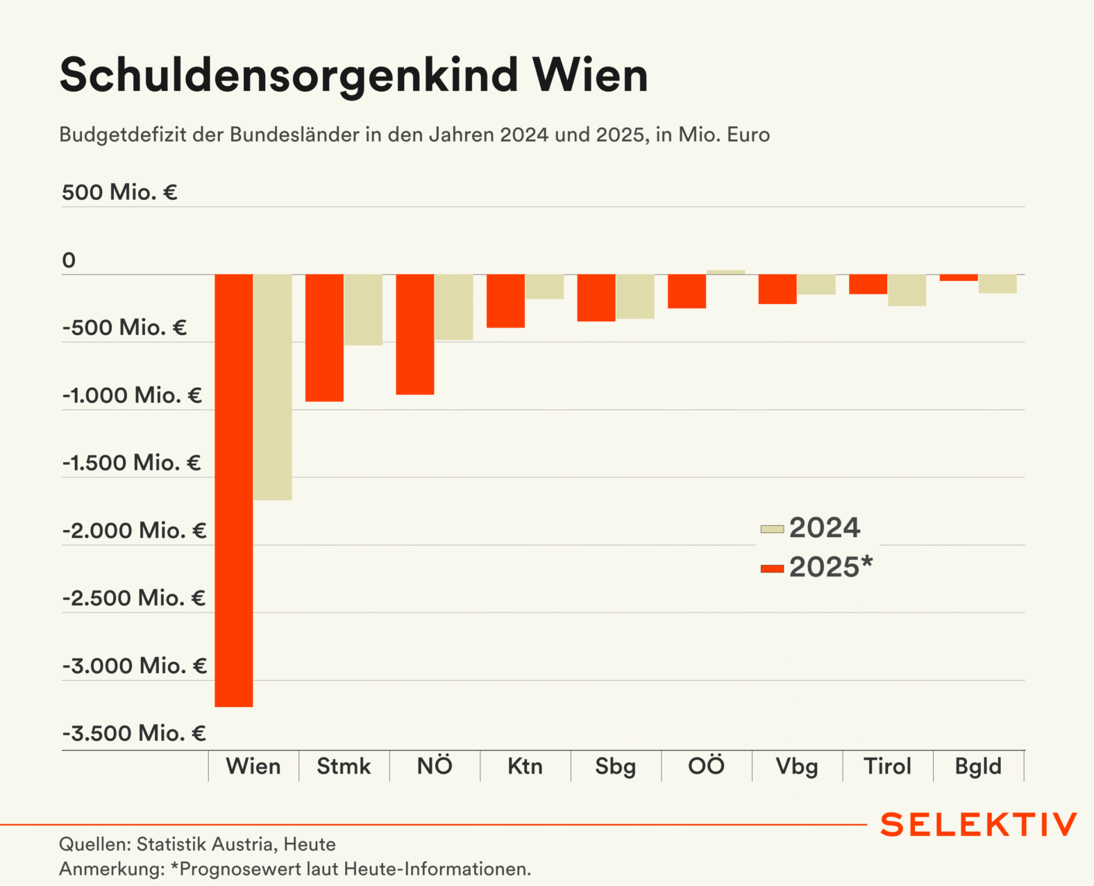 🇦🇹 Budgetdefizit soll auf 4,9 % steigen. Aufgrund höherer Verschuldung von Ländern und Gemeinden soll das gesamtstaatliche Defizit heuer auf 4,9 % steigen. Noch am Freitag hatte der Fiskalrat ein Budgetdefizit von 4,4 % für realistisch gehalten; das Finanzministerium selbst plante mit 4,5 %. Hauptverantwortlich für die Ausweitung des Budgetdefizits ist die höhere Verschuldung der Stadt Wien. Das Wiener Defizit soll im Jahr 2025 laut Heute-Informationen 3,2 Mrd. Euro und damit fast halb so viel wie die Gesamtverschuldung aller Bundesländer i. H. v. rund 6,5 Mrd. Euro ausmachen. Finanzminister Marterbauer will die Zahlen gegenüber der Presse nicht bestätigen und verweist auf die laufenden Verhandlungen zum Stabilitätspakt, die er noch heuer abschließen will. Zur Frage nach einem neuen Sparpaket kann Marterbauer aber „nicht ausschließen, dass man nachjustieren muss“. [Quellen: APA, Die Presse, Marterbauer in der Presse, Heute | Grafik von Christoph Hofer]