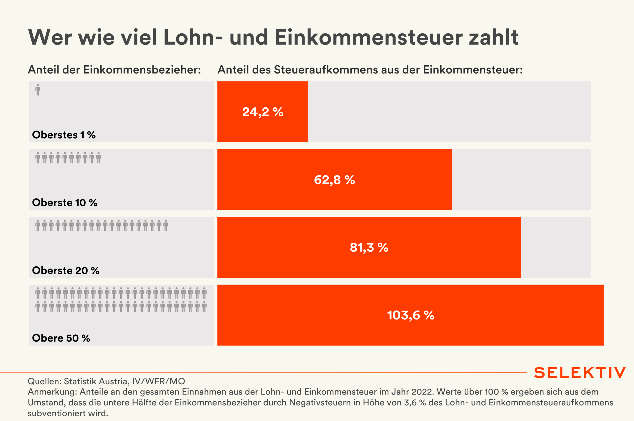 💡 Das oberste 1 % zahlt ein Viertel der Einkommensteuer. Am Freitag, dem 9. Jänner, fand der sogenannte „Fat Cat Day“ statt: An diesem Tag haben ATX-CEOs laut Berechnung der Arbeiterkammer bereits so viel verdient wie ein mittlerer österreichischer Beschäftigter im gesamten Jahr. Trotz – oder gerade wegen – dieser großen Verdienstunterschiede tragen die Spitzenverdiener überproportional zur Finanzierung des Gemeinwesens bei: Im Jahr 2022 entfielen auf das oberste 1 % der Einkommensbezieher bereits 24,2 % des gesamten Ertrags aus Lohn- und Einkommensteuer. Auf die obersten 10 % kamen sogar 62,8 % der Einnahmen, und die obere Hälfte der Einkommensbezieher trug insgesamt 103,6 % der Steuerlast (da die untere Hälfte durch Negativsteuern und Absetzbeträge netto mehr erhält als zahlt). Erst ab einem Jahreseinkommen von mehr als 20.000 Euro übersteigt der eigene Steuerbeitrag die erhaltenen Negativsteuern. [Quellen: Arbeiterkammer, Statistik Austria, Agenda Austria | Grafik von Christoph Hofer]
