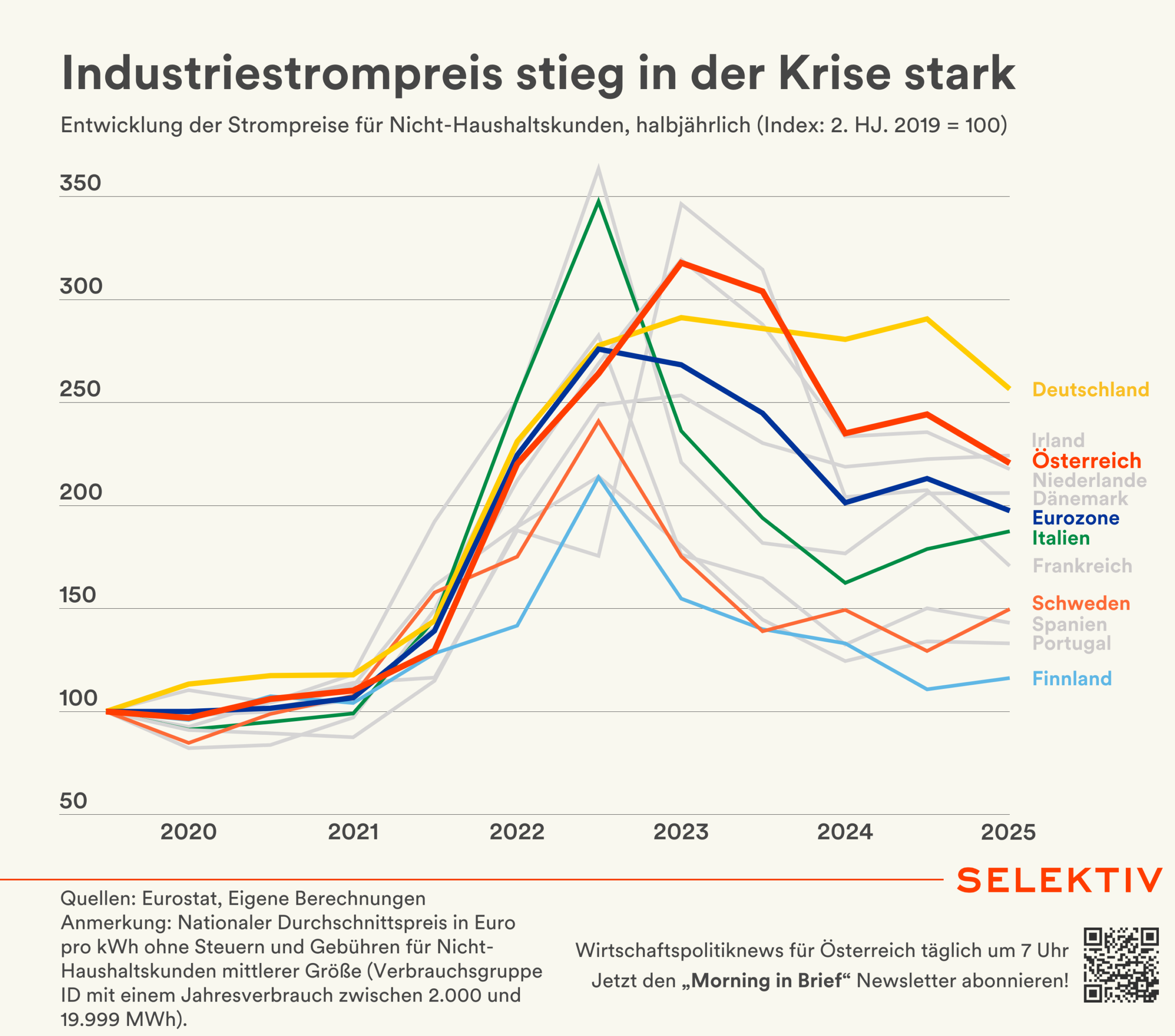 🇦🇹 Ruf nach Industriestrompreis wird lauter. WKÖ und Industriellenvereinigung erhöhen im Vorfeld der Präsentation der Industriestrategie erneut den Druck auf die Regierung, den Strompreis für die Industrie zu senken. Vorbild soll der deutsche Industriestrompreis von 5 Cent pro Kilowattstunde sein, außerdem brauche es eine Verlängerung der Strompreiskompensation bis 2030 statt deren Auslaufen Ende 2026. Wirtschaftsminister Wolfgang Hattmannsdorfer sieht ebenfalls Handlungsbedarf, Finanzminister Markus Marterbauer meinte am Sonntag, es brauche jedenfalls eine konkrete Gegenfinanzierung. IHS-Ökonom Klaus Weyerstrass und die Grünen bringen die Aufhebung des Dieselprivilegs als mögliche Finanzierungsquelle ins Spiel. Weyerstrass und Wifo-Chef Gabriel Felbermayr weisen zudem darauf hin, dass eine Senkung der Lohnnebenkosten ebenso wichtig ist wie eine Reduktion des Industriestrompreises. Jan Kluge von der Agenda Austria betont die internationale Abhängigkeit bei den Industriestromkosten und fordert zugleich eine stärkere Privatisierung des Strommarktes, um den Wettbewerb zu fördern. [Quellen: Ö1-Mittagsjournal, IV, WKÖ, Kronen Zeitung, Kurier, Die Grünen, Unos | Grafik: Industriestrompreis stieg in der Krise]