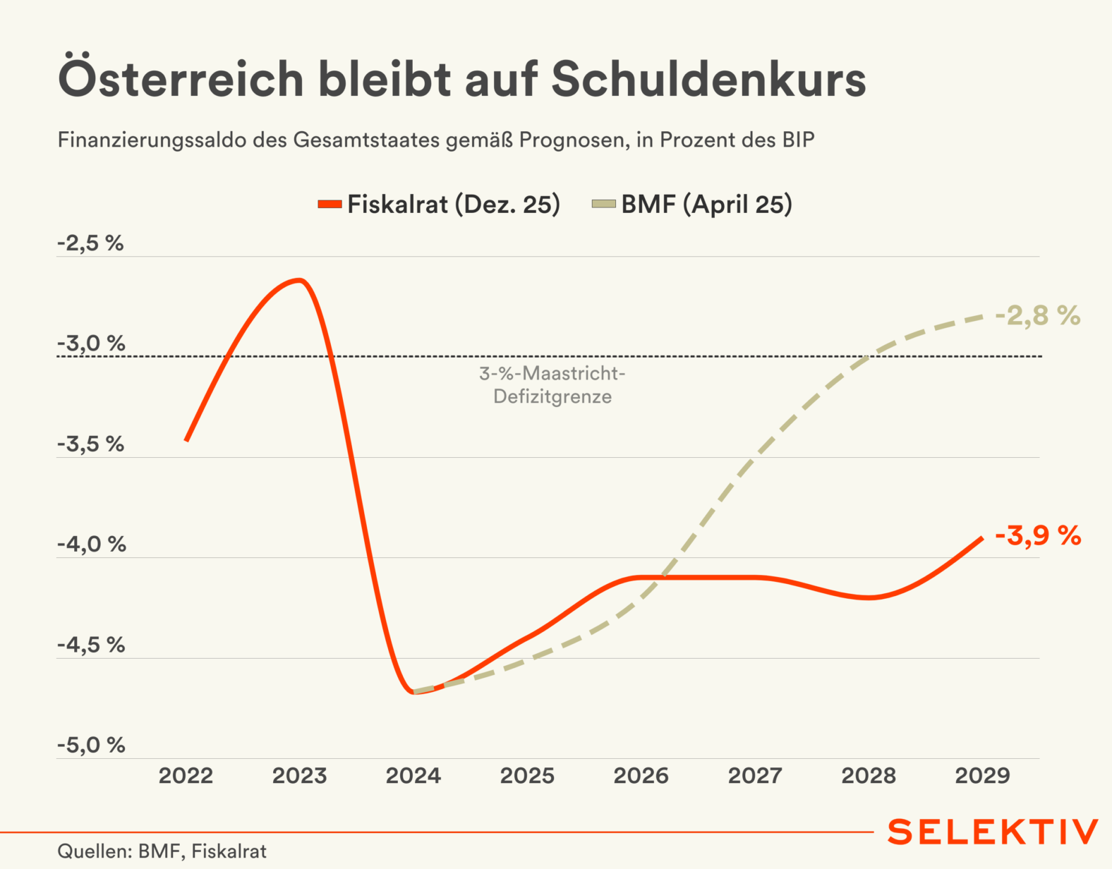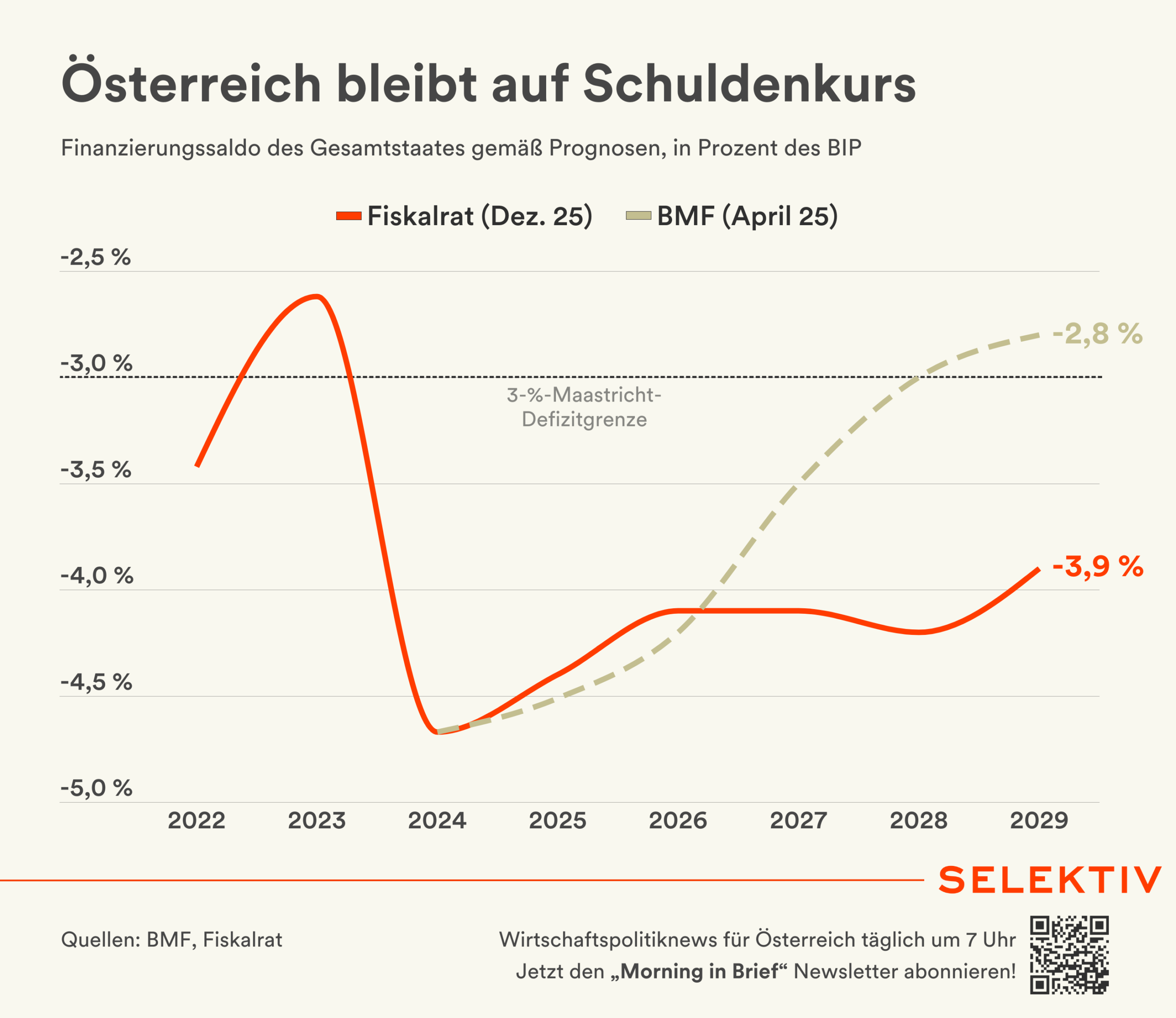 💡 Fiskalrat: Staat muss rund 9 Mrd. Euro zusätzlich sparen. Der Fiskalrat rechnet für 2025 und 2026 mit einem Budgetdefizit von 4,4 % bzw. 4,1 % des BIP. Die Maastricht-Defizitgrenze von 3 % könne nur unterschritten werden, wenn bis 2028 zusätzlich 8,9 Mrd. Euro konsolidiert werden. Den aktuellen Budgetpfad betrachtet der Fiskalrat daher als „lasche Vorgabe“: Solange das gesamtstaatliche Defizit nicht in die Nähe von 2 % des BIP sinke, werde die Staatsschuldenquote bis 2029 auf einen Rekordwert von 87,7 % steigen. Fiskalrats-Chef Christoph Badelt fordert eine zwischen den Gebietskörperschaften abgestimmte Konsolidierung mit starkem Fokus auf die Ausgabenseite. Nicht jedes „Goodie“ der Vergangenheit wie etwa der Familienbonus könne in der aktuellen Situation beibehalten werden. Darüber hinaus seien grundlegende Strukturreformen notwendig – etwa bei Pensionen, Gesundheit und im Förderwesen. [Quellen: Fiskalrat – Pressekonferenz, Aussendung, Jahresbericht, BMF | Reaktionen: Finanzminister Marterbauer, FPÖ, Neos, Grüne, IV, JW] | Grafik von Christoph Hofer]