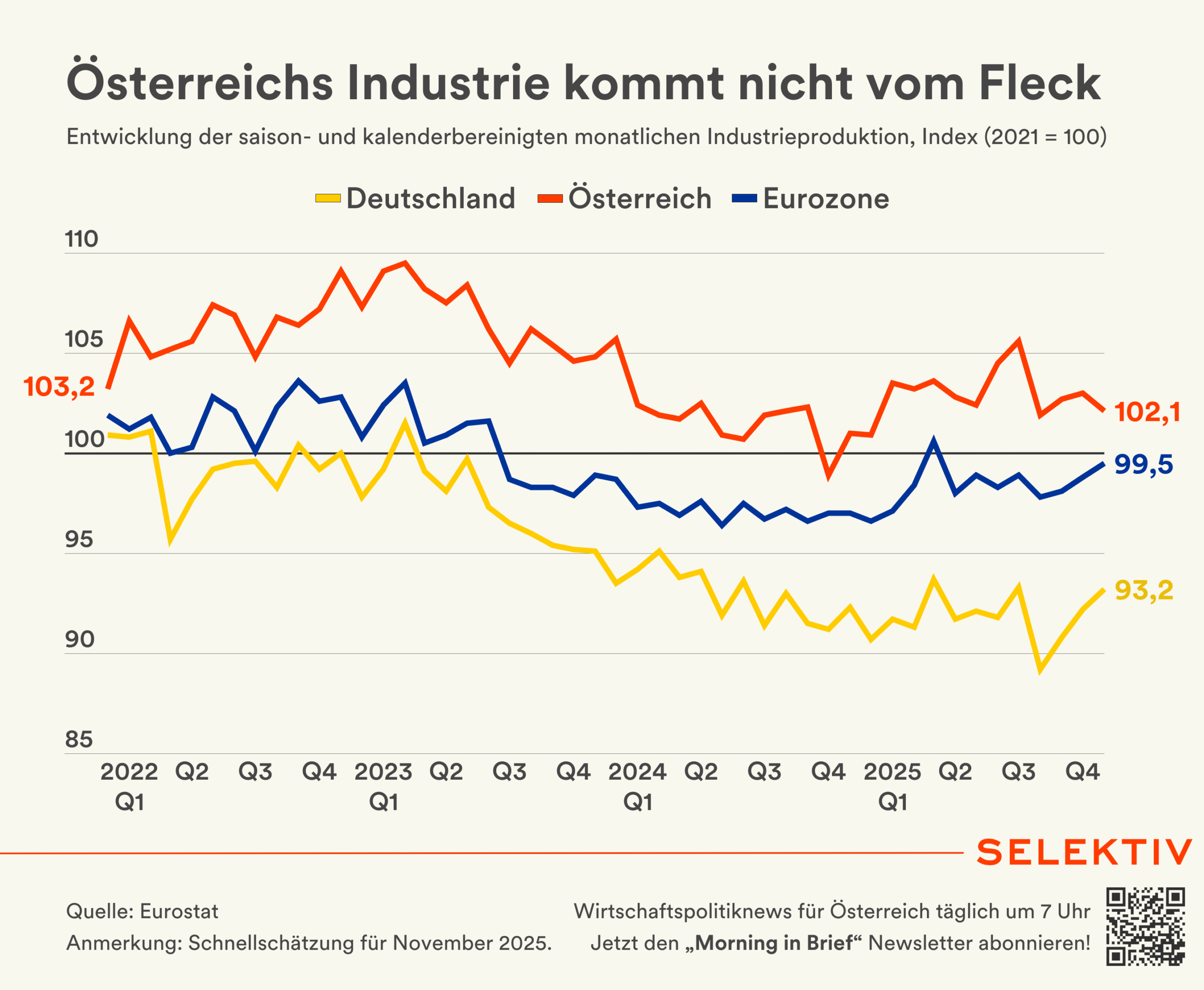 🇪🇺 Industrieproduktion in der Eurozone gestiegen. Zwischen Oktober und November legte die Industrieproduktion im Euroraum um 0,7 % und in der EU um 0,2 % zu. Im Vergleich zum Vorjahr gab es Zuwächse von 2,5 % in der Eurozone und 2,2 % in der EU. In Österreich ging die Industrieproduktion im Monatsabstand um 0,9 % zurück, während sie im Jahresabstand um 1,0 % anstieg. Deutschland verzeichnete im Monatsvergleich ein Plus von 1,1 % und gegenüber 2024 einen Anstieg um 1,0 %. [Quelle: Eurostat | Grafik: Österreichs Industrie kommt nicht vom Fleck]