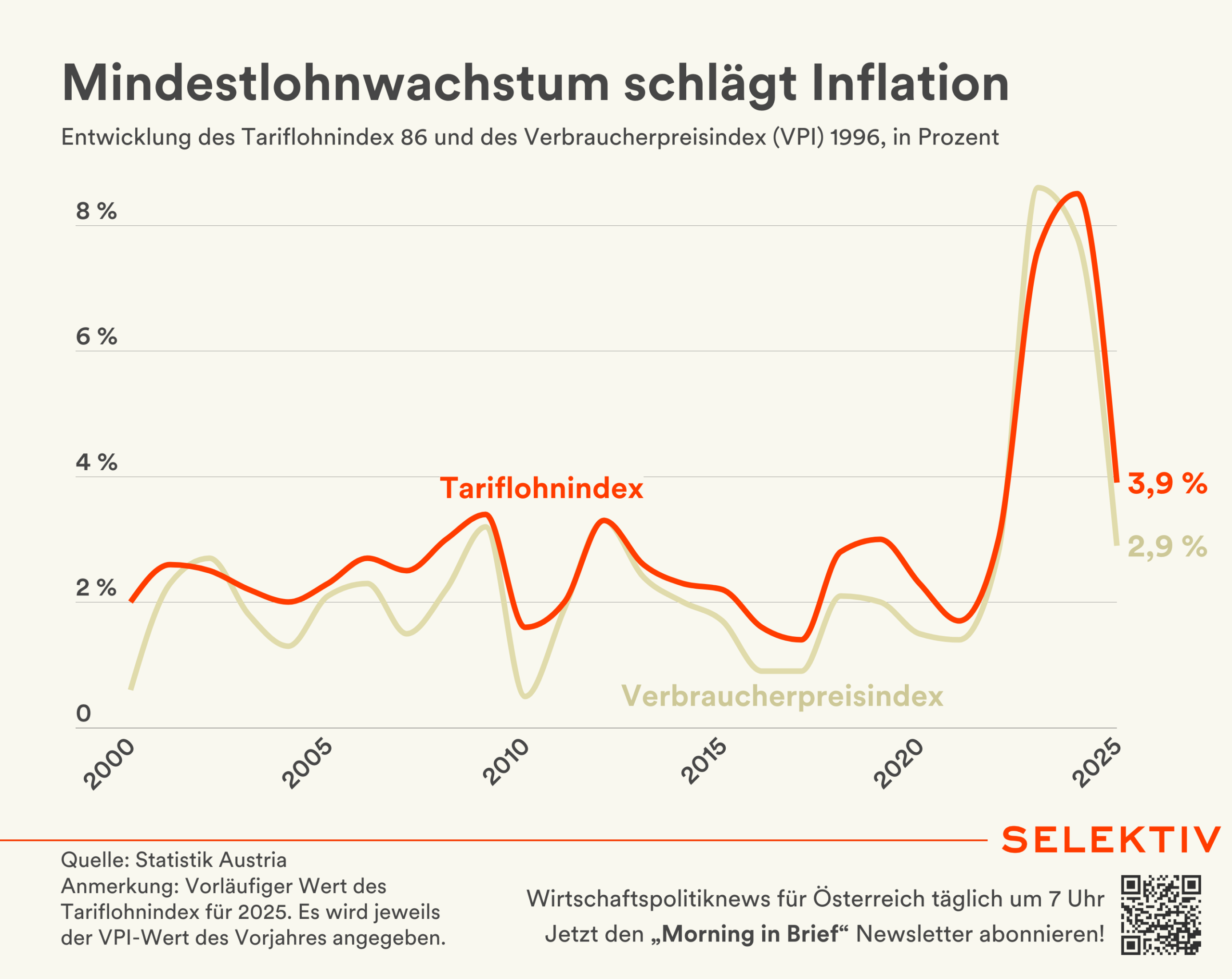 💡 Mindestlöhne stärker als Inflation gestiegen. Der Tariflohnindex ist im Jahr 2025 mit 3,9 % deutlich stärker gestiegen als die Inflationsrate des Jahres 2024 von 2,9 %. „Seit der Jahrtausendwende sind die Mindestlöhne und -gehälter in Österreich mit wenigen Ausnahmen jährlich stärker gestiegen als die Inflation des Vorjahres. Auch 2025 gab es einen Reallohngewinn“, hält Manuela Lenk, fachstatistische Generaldirektorin von Statistik Austria, fest. Im Jahr 2023 gab es zwar einen Reallohnverlust (0,9 Prozentpunkte unter VPI), im Jahr 2024 konnte dieser mit einem Plus von 0,7 Prozentpunkten aber wieder weitestgehend ausgeglichen werden. [Quelle: Statistik Austria | Grafik von Christoph Hofer und Stephan Frank]