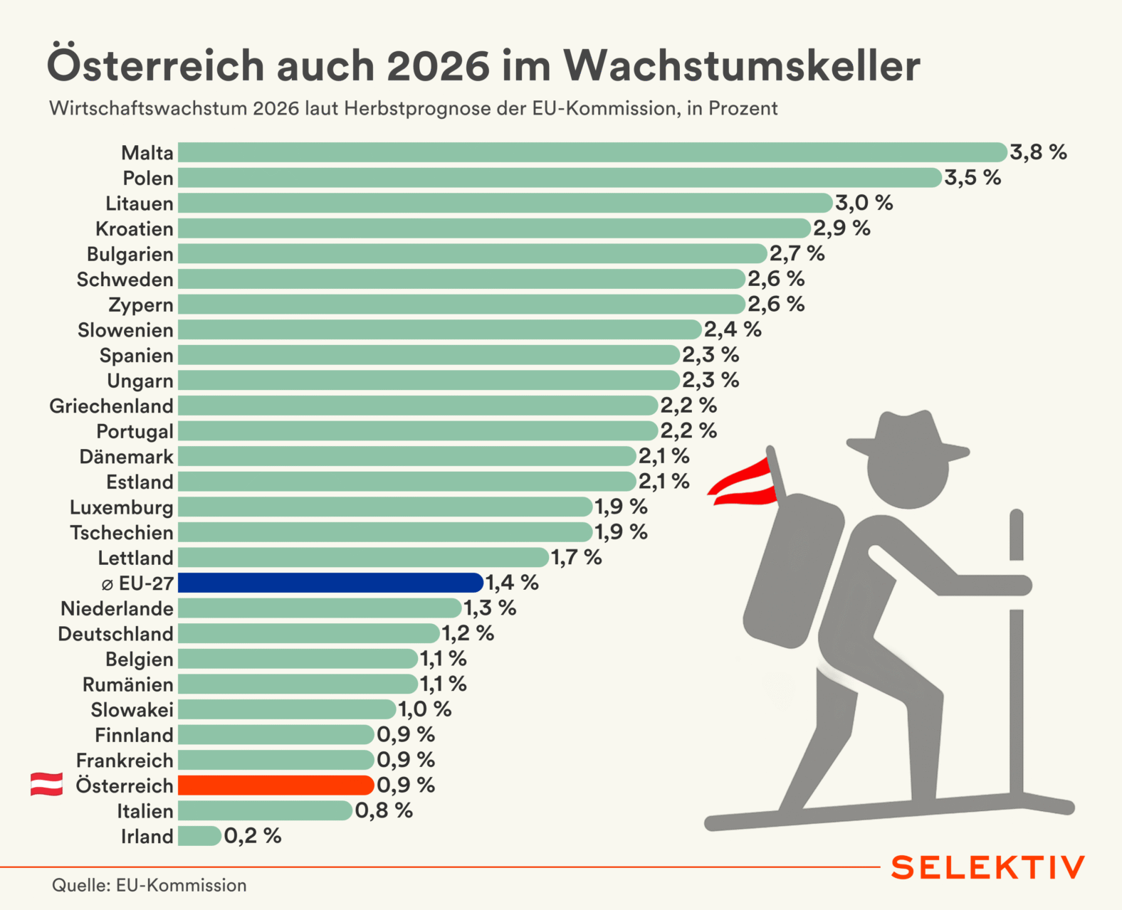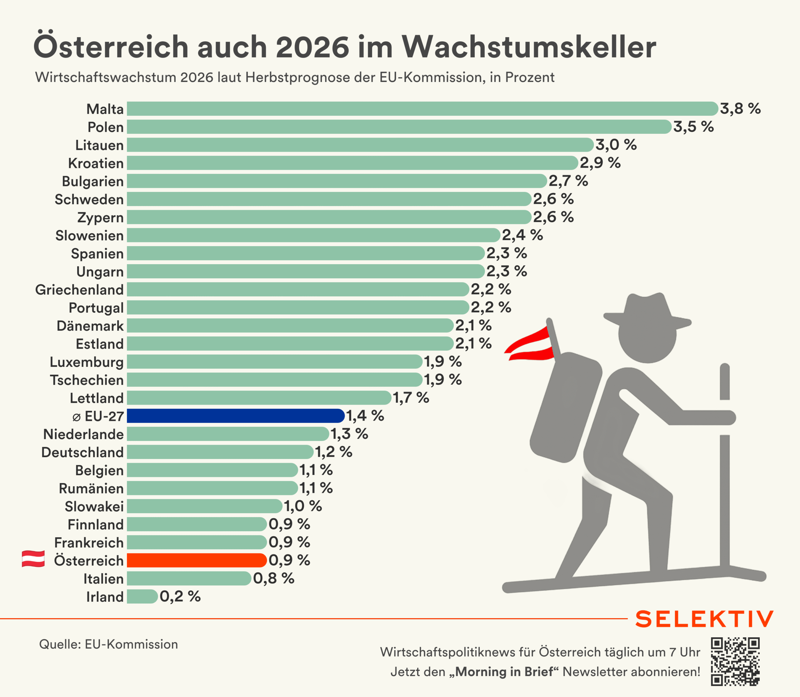 💡 Heimisches BIP soll nächstes Jahr um 0,9 % wachsen. Die Europäische Kommission erwartet in ihrer Herbstprognose für Österreich ein Wirtschaftswachstum von 0,3 % im heurigen Jahr, 0,9 % im Jahr 2026 und 1,2 % im Jahr 2027. Die österreichische Wirtschaftsentwicklung liegt damit weiterhin unterhalb des EU-27-Schnitts von 1,4 %. Österreich erreicht mit 0,9 % Wachstum den drittletzten Platz innerhalb der EU, nur Italien und Irland wachsen nächstes Jahr noch schwächer. Das heimische Budgetdefizit dürfte laut EU-Kommission heuer bei 4,4 % liegen, nächstes Jahr auf 4,1 % sinken und 2027 wieder auf 4,3 % ansteigen. Die Inflation soll sich nächstes Jahr auf 2,4 % abschwächen, damit aber weiterhin über dem Eurozonen-Durchschnitt von 1,9 % liegen. „Die Zeit der Negativrekorde bei Wachstum und Inflation ist vorbei, die Herausforderungen sind aber geblieben. Weniger schlecht ist noch lange nicht gut“, mahnt Raiffeisen-Research-Ökonom Matthias Reith. [Quellen: EU-Kommission – Herbstprognose, Österreich; Reith auf Linkedin | Reaktionen: FPÖ, IV | Grafik von Stephan Frank]