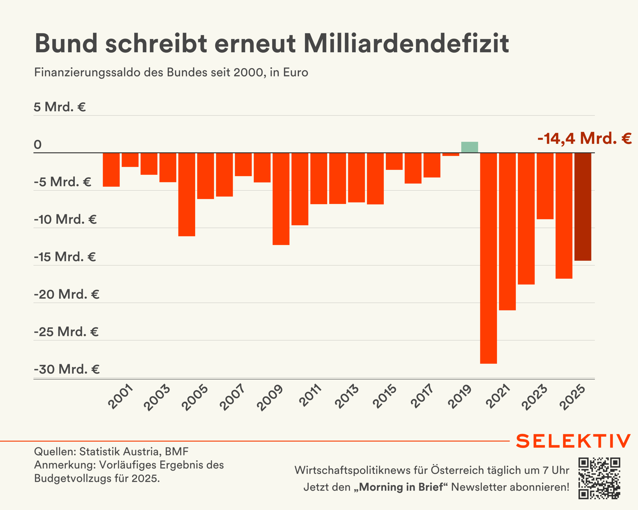 💡 Budgetdefizit des Bundes 2025 liegt bei 14,4 Mrd. Euro. Laut vorläufigem Ergebnis des Budgetvollzugs beträgt das Defizit des Bundes im Jahr 2025 rund 14,4 Mrd. Euro. Damit liegt es 3,7 Mrd. Euro unter dem ursprünglich geplanten Defizit von rund 18,1 Mrd. Euro. Gegenüber 2024 stiegen die Ausgaben des Bundes um 0,6 % auf 121,5 Mrd. Euro, während die Einnahmen deutlich stärker um 5,4 % auf 107,1 Mrd. Euro zunahmen. Laut Bundesregierung wirken sich die gestiegenen Einnahmen – insbesondere aus Zinsen und konjunkturbedingten Steuern – im Rahmen der EU-Fiskalregeln jedoch nicht positiv auf den Maastricht-Saldo aus. Aus diesem Grund bleibt ein strenger Budgetvollzug in allen Gebietskörperschaften weiterhin erforderlich. Die gesamtstaatlichen Budgetzahlen (einschließlich Länder und Gemeinden) sollen Ende März veröffentlicht werden. [Quellen: Statistik Austria, BMF, Bundesvoranschlag 2025, ORF-Pressestunde | Reaktionen: Neos, Die Grünen, FPÖ | Grafik von Christoph Hofer]