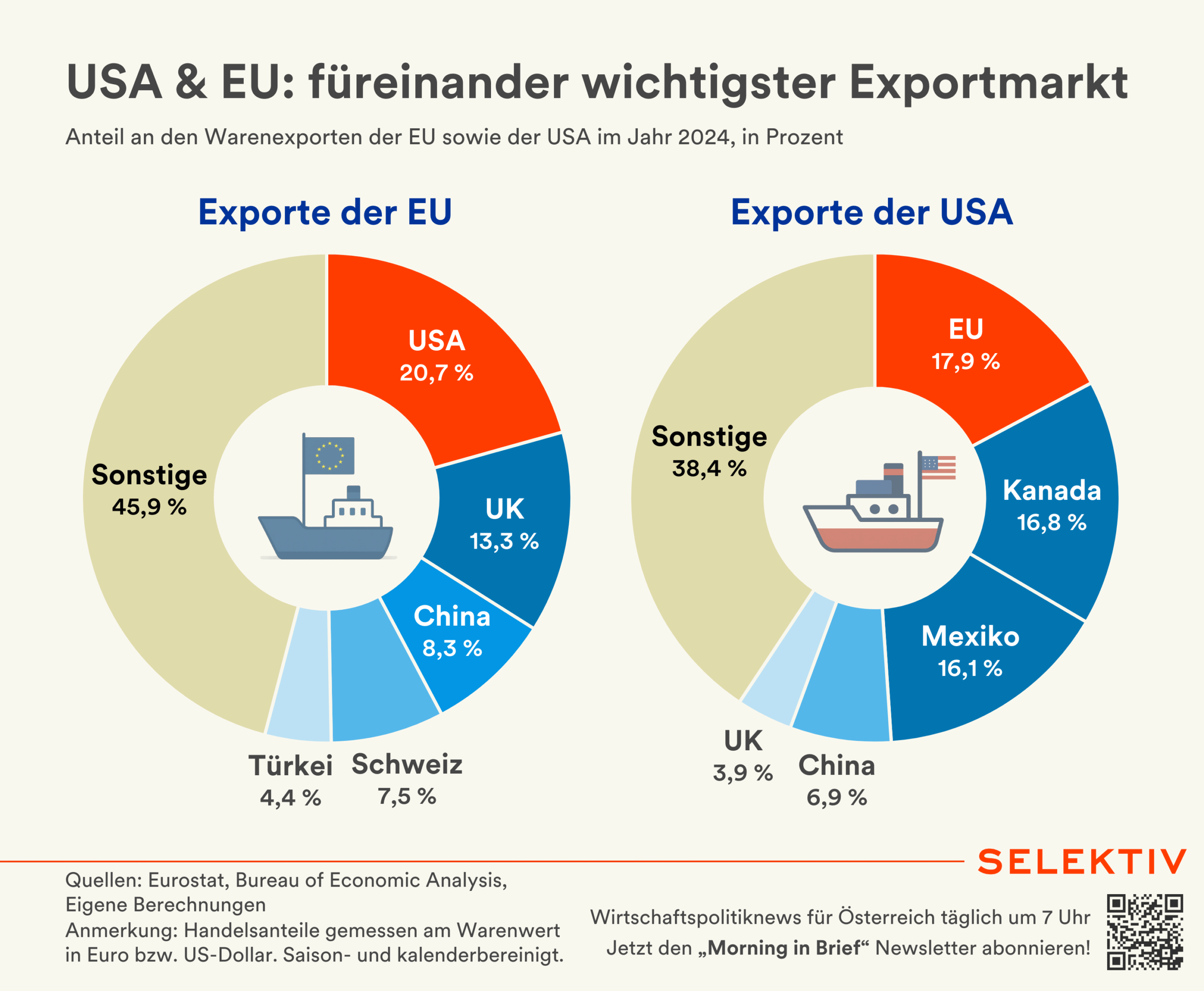 💡 Exportabhängigkeit zwischen USA und EU ist hoch. 2024 gingen mehr als ein Fünftel (20,7 %) aller EU-Exporte in die USA – damit liegen die USA klar auf Platz 1 vor dem Vereinigten Königreich (13,3 %) und China (8,3 %). Umgekehrt entfielen 17,9 % der US-Warenexporte auf die EU – ebenfalls der erste Platz unter den US-Exportzielen, knapp vor Kanada (16,8 %) und Mexiko (16,1 %). Jährlich werden Waren im Wert von über 800 Mrd. Euro zwischen den USA und der EU gehandelt. [Quellen: Eurostat, Bureau of Economic Analysis | Grafik von Christoph Hofer]