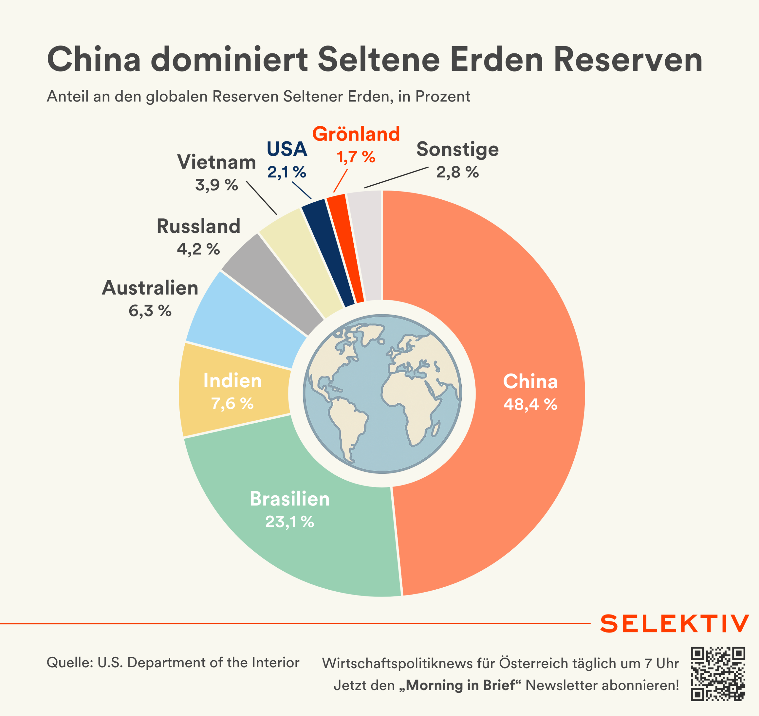 💡 Kaum Vorkommen Seltener Erden im Westen. Der Markt für Seltene Erden wird aktuell stark von China dominiert. Nicht nur der Großteil der weltweiten Verarbeitung findet dort statt – China verfügt auch über die mit Abstand größten bekannten Reserven: rund 44 Mio. Tonnen REO (Rare-Earth-Oxide-Äquivalent), was etwa 48 % der globalen Gesamtreserven entspricht. Weitere bedeutende Reserven befinden sich in Brasilien (23,1 %), Indien (7,6 %) und Australien (6,3 %). Die USA kommen auf 1,9 Mio. Tonnen (2,1 %), Grönland auf 1,5 Mio. Tonnen (1,7 %) REO. Seltene Erden wie Neodym, Dysprosium oder Terbium sind für die Produktion moderner Halbleiter und damit für die Schlüsseltechnologien der Künstlichen Intelligenz unverzichtbar. [Quelle: U.S. Department of the Interior | Grafik von Christoph Hofer]
