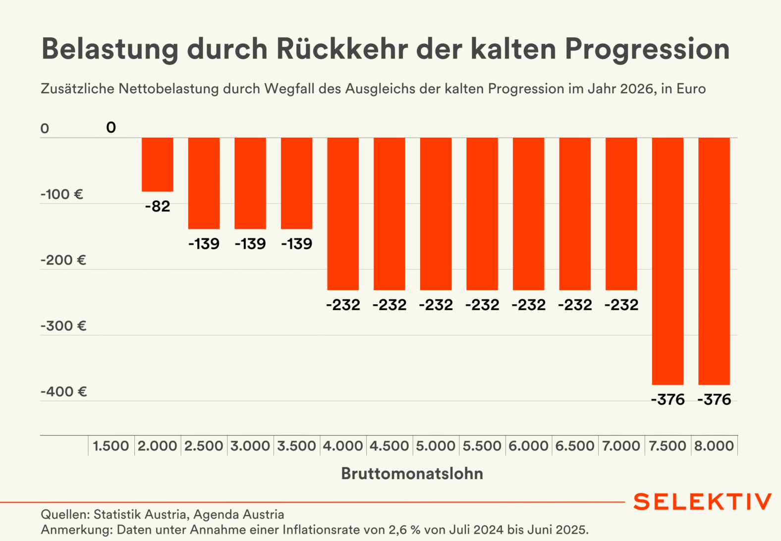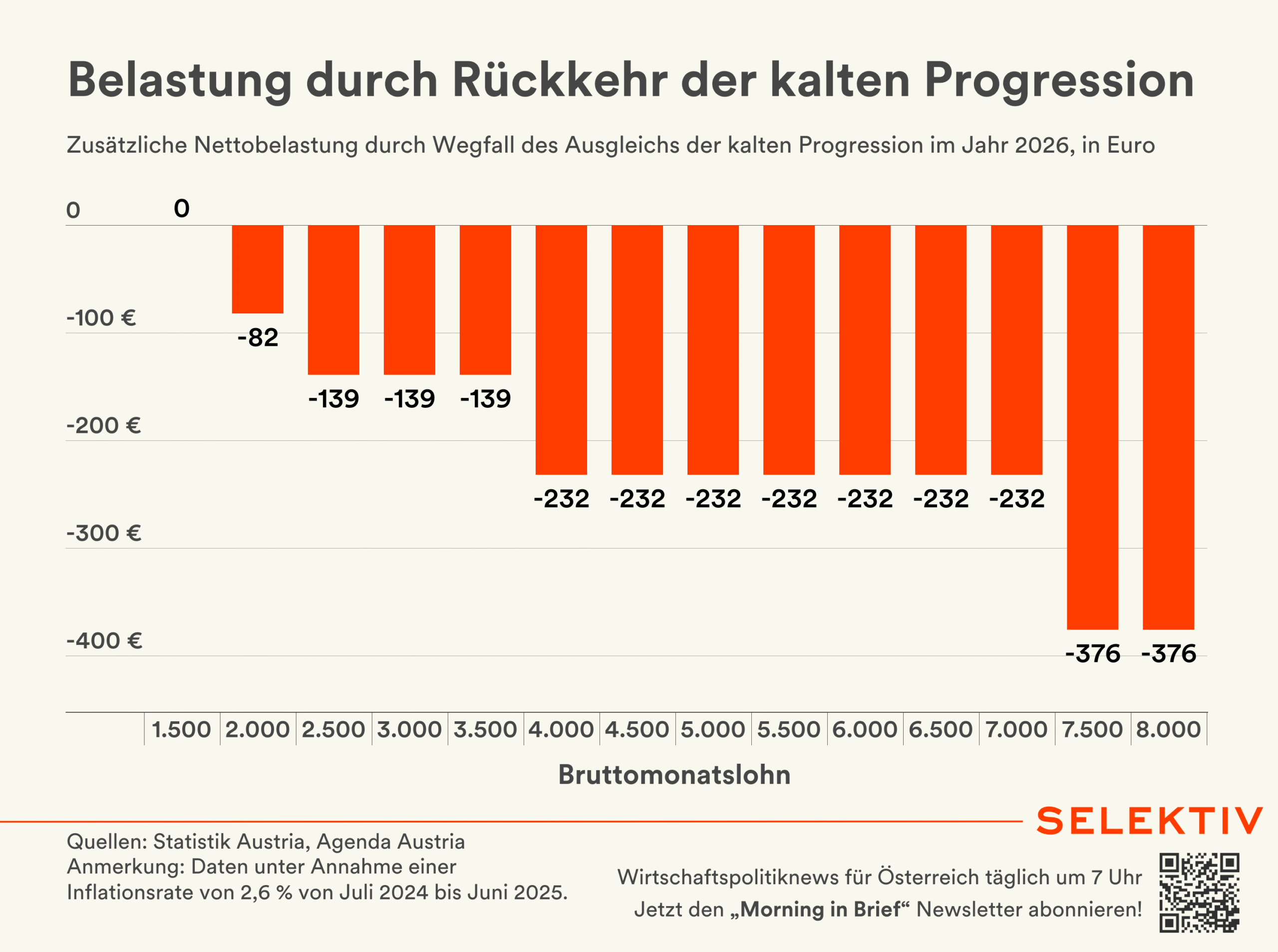 💡 Comeback der kalten Progression kostet Arbeitnehmer bis zu 376 Euro. Käme es 2026 zu einer vollständigen Wiedereinführung der kalten Progression, würden österreichische Arbeitnehmer zusätzlich mit rund 1 Mrd. Euro belastet, wie Berechnungen der Agenda Austria zeigen. Bis zum Ende der Legislaturperiode 2029 summierte sich die Mehrbelastung je nach Einkommen auf bis zu 1.500 Euro pro Person. „Besonders betroffen wären mittlere und höhere Einkommen, für die die kalte Progression spürbare Nettolohnverluste bedeutet“, so Agenda-Austria-Ökonom Dénes Kucsera. Von der Regierung bereits fixiert ist die Aussetzung des Ausgleichs eines Drittels der kalten Progression. [Quellen: Statistik Austria, Agenda Austria | Grafik von Christoph Hofer]