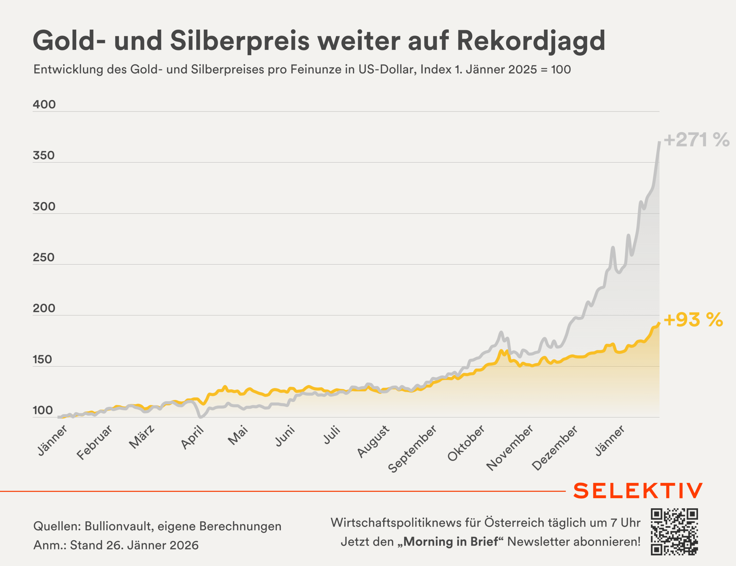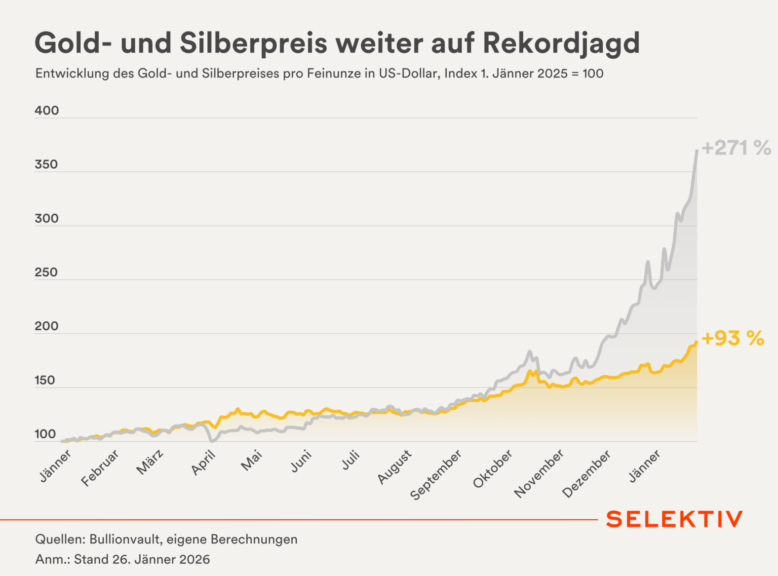 💡 Edelmetalle auf Rekordkurs. Seit Jänner 2025 hat sich der Goldpreis in US-Dollar gemessen nahezu verdoppelt. Der Silberpreis verzeichnete mit einem Anstieg von 271 % ein noch stärkeres Wachstum. Bei beiden Edelmetallen jagt derzeit ein Rekordhoch das nächste. Gestern hat der Preis für eine Feinunze Gold kurzfristig die Schwelle von 5.110 US-Dollar überschritten, eine Feinunze Silber erreichte die Marke von 110 US-Dollar. Analysten zufolge könnte der Goldpreis heuer auch noch die Marke von 6.000 US-Dollar erreichen. Aktuelle Preistreiber sind „Trump und nochmal Trump“ sowie Privatpersonen, die erstmals in Edelmetalle investieren, so Ökonom Adrian Ash gegenüber Reuters. [Quellen: Bullionvault, Reuters, eigene Berechnungen | Grafik von Stephan Frank]