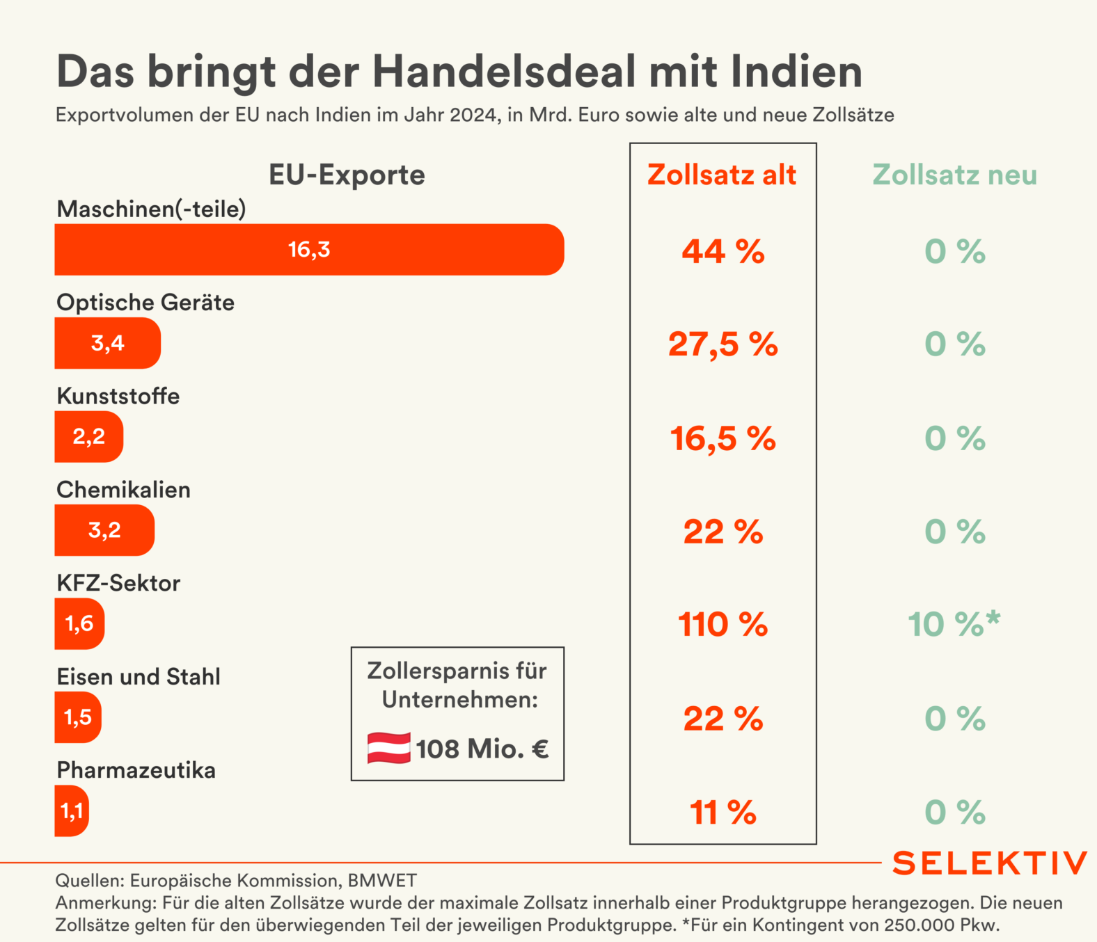 💡 EU-Indien-Handelsdeal bringt heimischen Unternehmen 108 Mio. Euro Zollersparnis. Das neue Freihandelsabkommen zwischen der EU und Indien senkt Zölle auf EU-Exporte teils erheblich – besonders in für Österreich relevanten Bereichen wie Maschinen und Maschinenteile, optische Geräten, Eisen und Stahl. Hier fallen die Zölle in den nächsten Jahren von bis zu 44 % meist auf 0 %. Im Automobilsektor sinkt der indische Zollsatz für ein jährliches Kontingent von 250.000 Pkw schrittweise von 110 % auf 10 %. Österreichische Unternehmen können jährlich mit einer Zollersparnis von rund 108 Mio. € rechnen. Kurzfristig erwartet Wifo-Direktor Gabriel Felbermayr ein BIP-Plus von etwa 0,1 %. „Langfristig steigen die Effekte dann aber an, sofern die Zollsenkungspläne eingehalten werden“. [Quellen: Europäische Kommission, BMWET, Felbermayr auf X | Grafik von Christoph Hofer]