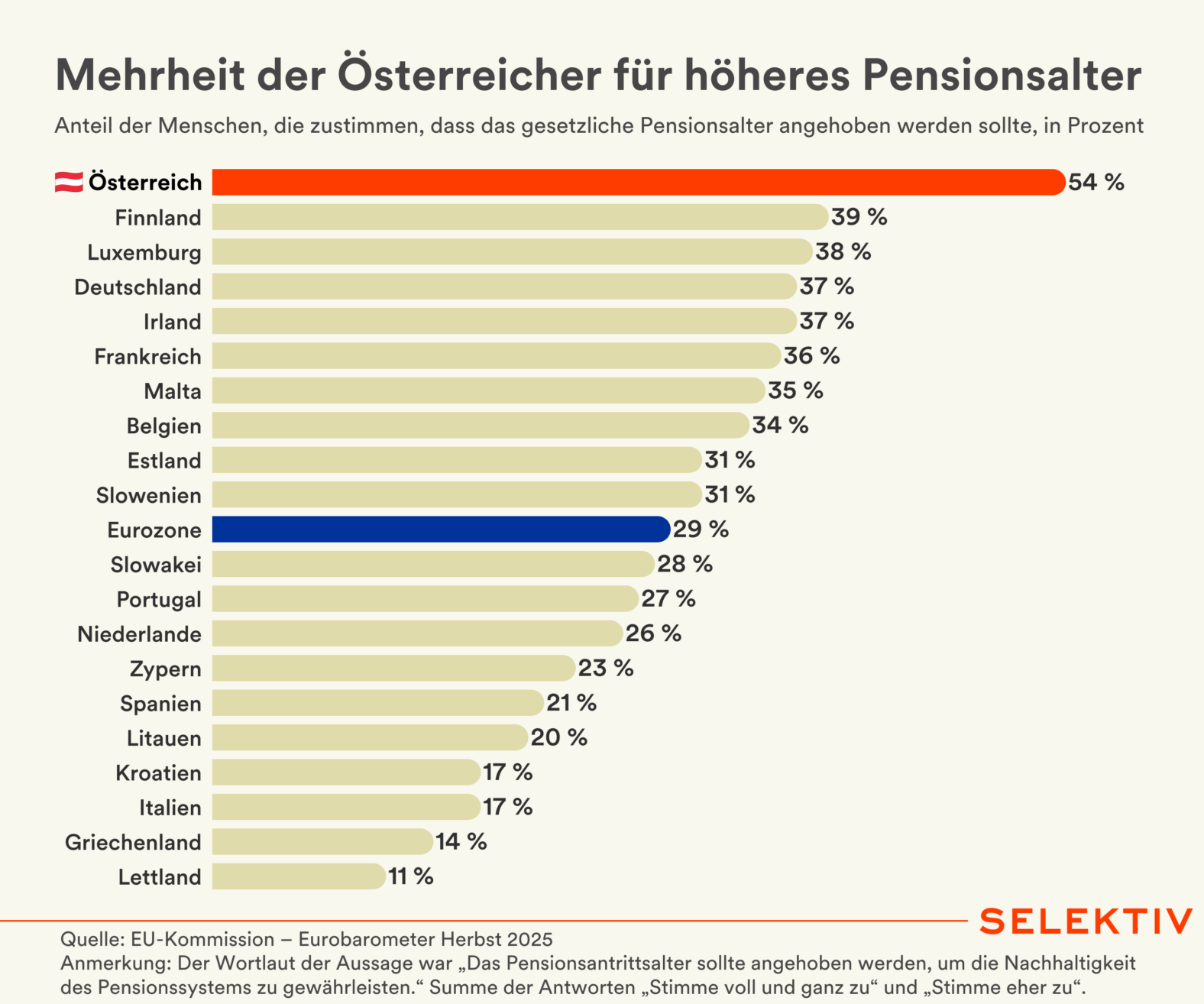 💡 Jeder Zweite ist bereits für höheres gesetzliches Pensionsalter. In einer Eurobarometer-Erhebung im Herbst gaben 54 % der Österreicher an, dass sie ein höheres gesetzliches Pensionsalter unterstützen, um die Nachhaltigkeit des heimischen Pensionssystems zu gewährleisten. In keinem anderen befragten Land fand sich hierfür eine Mehrheit. Am höchsten war die Zustimmung noch in Finnland (39 %) und Luxemburg (38 %), am geringsten in Griechenland (14 %) und Lettland (11 %). Der Eurozonen-Durchschnitt lag bei 29 %. [Quellen: EU-Kommission, dieSubstanz.at | Grafik von Christoph Hofer]