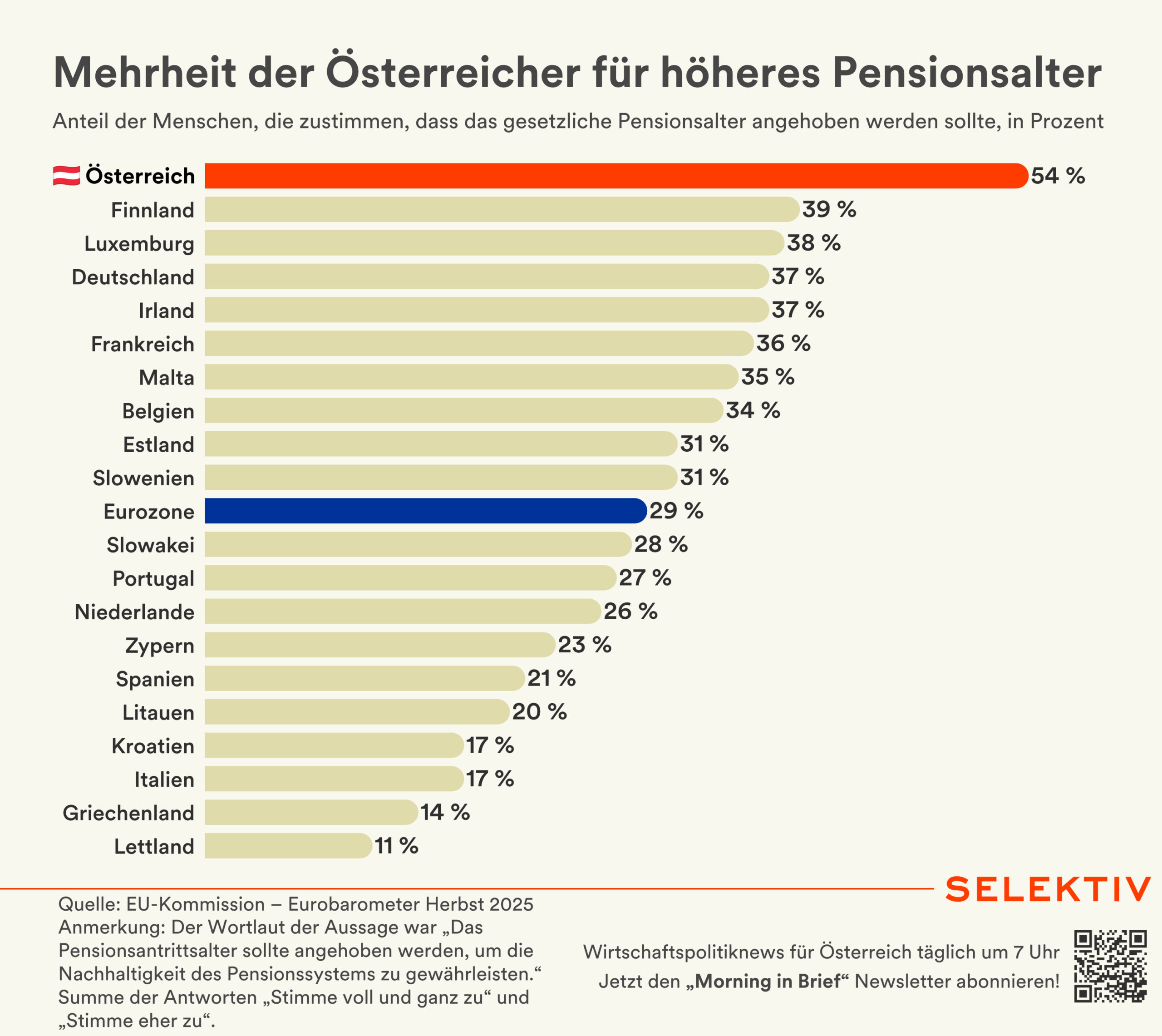 💡 Jeder Zweite ist bereits für höheres gesetzliches Pensionsalter. In einer Eurobarometer-Erhebung im Herbst gaben 54 % der Österreicher an, dass sie ein höheres gesetzliches Pensionsalter unterstützen, um die Nachhaltigkeit des heimischen Pensionssystems zu gewährleisten. In keinem anderen befragten Land fand sich hierfür eine Mehrheit. Am höchsten war die Zustimmung noch in Finnland (39 %) und Luxemburg (38 %), am geringsten in Griechenland (14 %) und Lettland (11 %). Der Eurozonen-Durchschnitt lag bei 29 %. [Quellen: EU-Kommission, dieSubstanz.at | Grafik von Christoph Hofer]