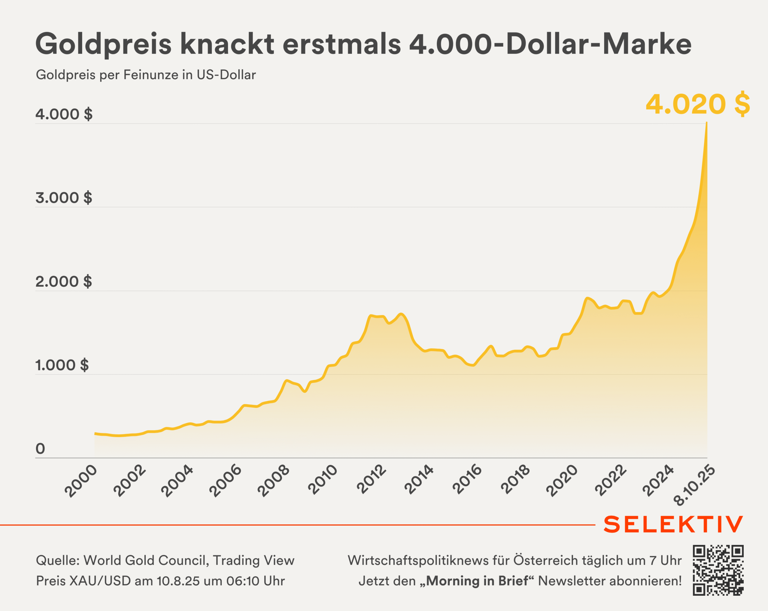 🌐 Goldpreis knackt 4.000-Dollar-Marke. Der Goldpreis für eine Feinunze Gold hat heute Früh ein neues Rekordhoch erreicht und dabei die Grenze von 4.000 US-Dollar überschritten. Kurz nach 6 Uhr wurde eine Feinunze um 4.020,82 US-Dollar gehandelt. J. P. Morgan hatte das Erreichen der 4.000-Dollar-Marke erst für Mitte 2026 erwartet. Analysten sprechen mittlerweile schon von „der nächsten großen runden Zahl“ von 5.000 US-Dollar pro Feinunze. Im laufenden Jahr hat der Goldpreis in US-Dollar gemessen bereits um 53 % zugelegt. „Die Marktdynamik niedrigerer US-Zinsen und der anhaltende Government Shutdown wirken sich weiterhin positiv auf Gold aus“, so Analyst Tim Waterer gegenüber Reuters. [Quellen: Reuters, Tradingview | Grafik: Goldpreis knackt 4.000-Dollar-Marke]
