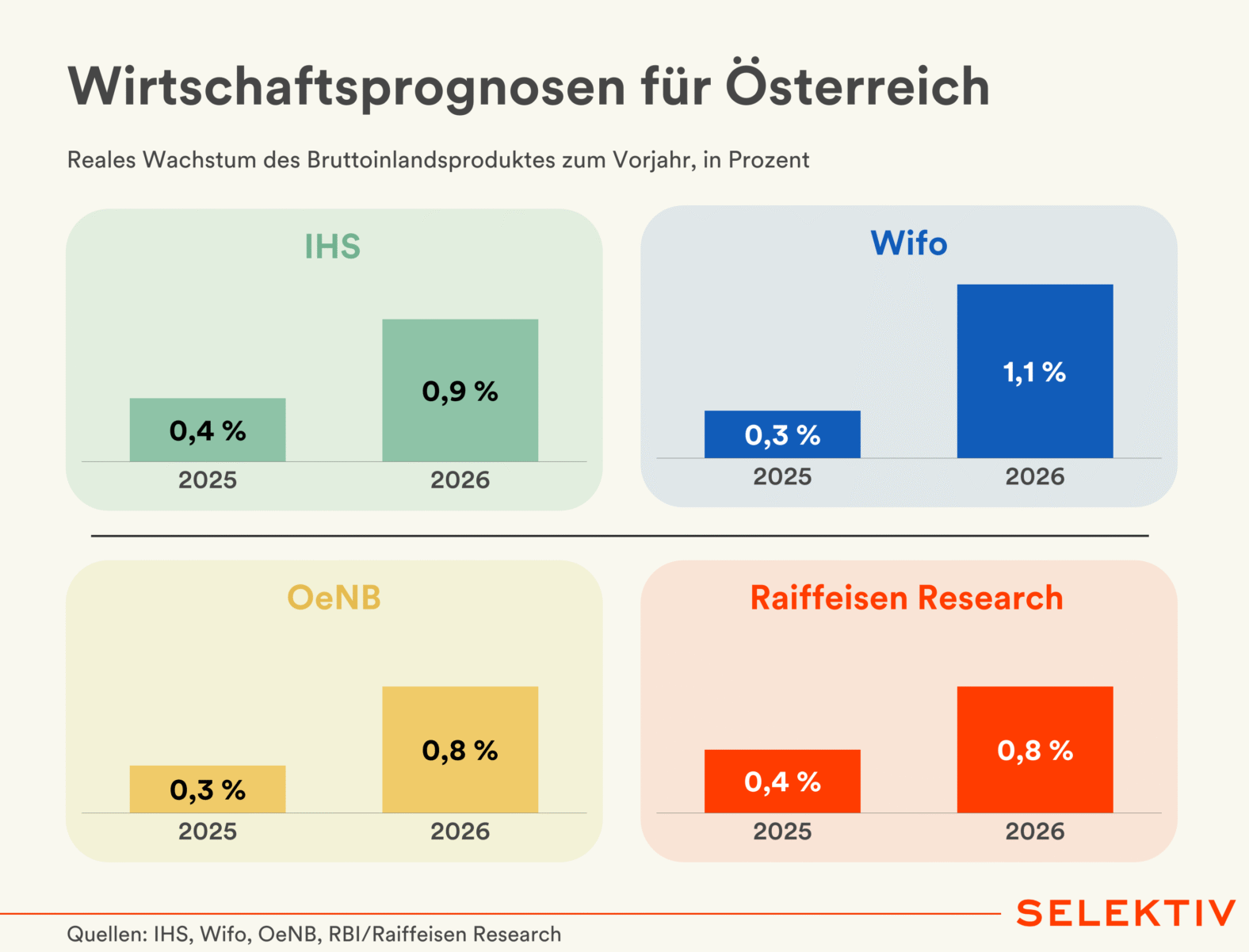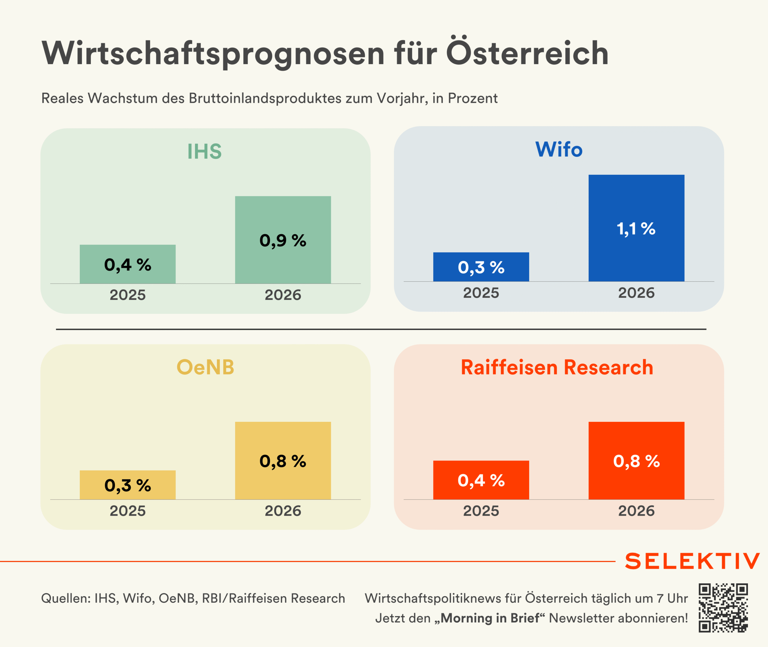🇦🇹 Konjunkturprognose: Mitten im „verlorenen Jahrzehnt“. Wifo und IHS sehen die Rezession in Österreich überwunden, jedoch sei noch kein echter Aufschwung in Sicht. Das Wifo prognostiziert für heuer ein Wirtschaftswachstum von 0,3 %, das IHS 0,4 %. Für 2026 erwartet das Wifo 1,1 % Wachstum, das IHS 0,9 %. Das reale BIP pro Kopf werde heuer immer noch um 3 % kleiner sein als im Vorkrisenjahr 2019, erst 2030 wird der Vorkrisenwert übertroffen werden. Wifo-Direktor Gabriel Felbermayr spricht von einem „verlorenen Jahrzehnt“. Aufgrund der höheren Inflation wird die österreichische Wirtschaft mittelfristig um 0,2 Prozentpunkte schwächer wachsen als der Euroraum-Durchschnitt. Das Wifo erwartet weiterhin eine „angespannte“ budgetäre Situation und prognostiziert für 2025 ein Defizit von 4,1 % des BIP, für 2026 dann 3,9 %. Bis 2030 soll das Budgetdefizit mit durchschnittlich 3,8 % deutlich über der Maastricht-Grenze von 3 % bleiben. Felbermayr empfiehlt im Rahmen einer Reformpartnerschaft u. a. eine Reform der Arbeitslosenversicherung und der Grundsteuer sowie eine Reduktion der MwSt auf Lebensmittel, gegenfinanziert durch Anhebung des allgemeinen MwSt-Satzes. [Quellen: Wifo-Prognose, IHS-Prognose, OeNB-Prognose, Raiffeisen-Research-Prognose, Statement Felbermayr im Wortlaut | Reaktionen: WKÖ, BMF, Finanzminister Marterbauer, ÖGB, ÖVP, SPÖ, Neos, FPÖ, Junos]