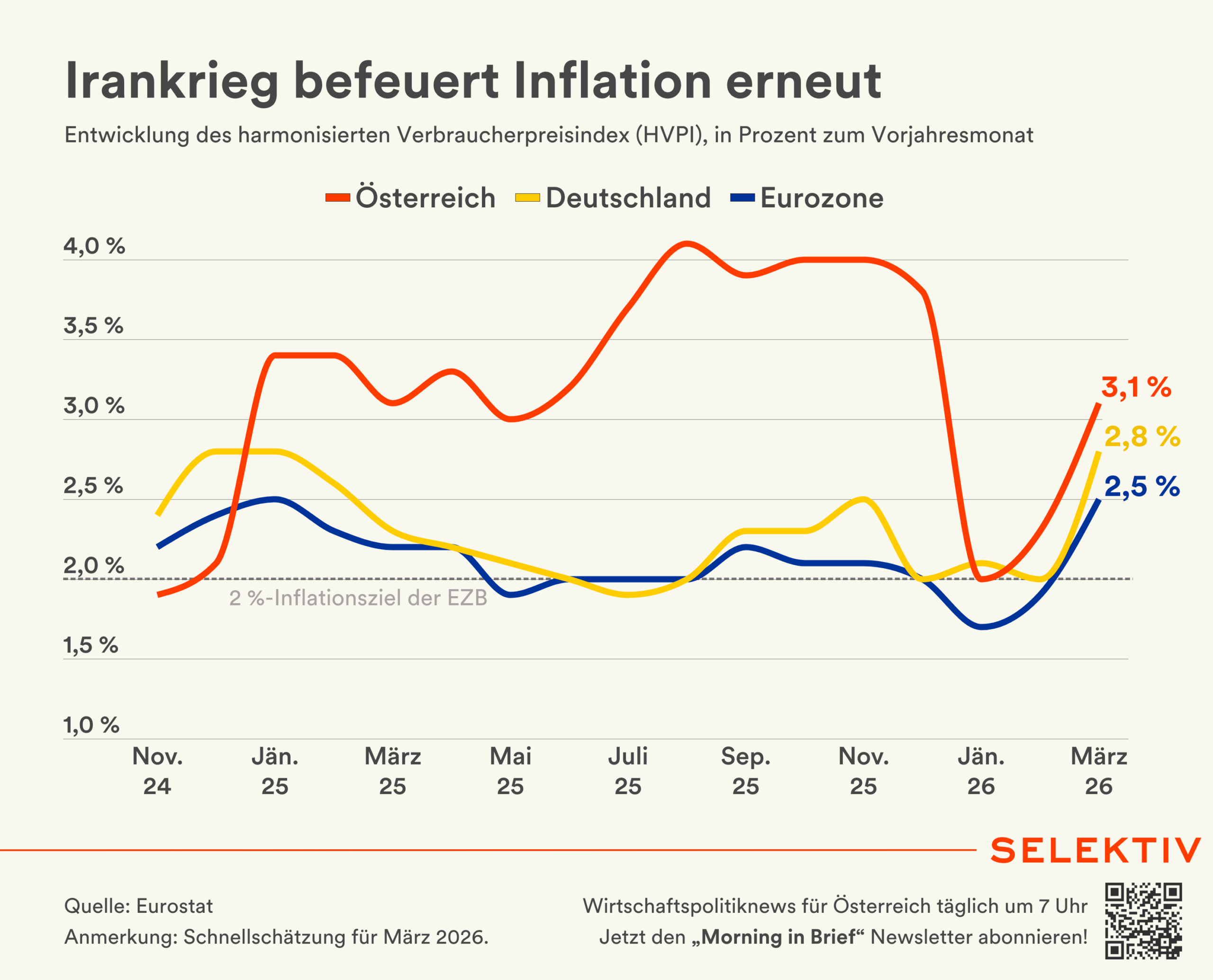 🇦🇹 Inflation steigt auf 3,1 %. Laut Schnellschätzung lag die österreichische Inflation im März bei 3,1 %. Im Monatsabstand stiegen die Preise voraussichtlich um 1,1 %. Der Anstieg geht laut Statistik Austria „fast vollständig“ auf Treibstoffe und Heizöl zurück. Bisher wirkten die Energiepreise preisdämpfend (Februar -4,1 %), im März stiegen sie im Jahresvergleich jedoch um 6,1 %. Auch Dienstleistungen verteuerten sich um 4,5 %. Die Preisanstiege bei Nahrungsmitteln, Tabak und Alkohol entwickelten sich mit 2,4 % noch unterdurchschnittlich, auch Industriegüter legten nur um 0,5 % zu. Finanzmarktexperte Peter Brezinschek erwartet auch in diesen Bereichen „mittelfristig negative Auswirkungen“ und hält einen Anstieg der Inflation auf „deutlich über 4 %“ für realistisch. [Quellen: Statistik Austria, Brezinschek auf Linkedin | Grafik: Irankrieg befeuert Inflation erneut | Reaktionen: FPÖ/Belakowitsch, FPÖ/Kassegger, Grüne, SPÖ NÖ, ÖGB, Volkshilfe]