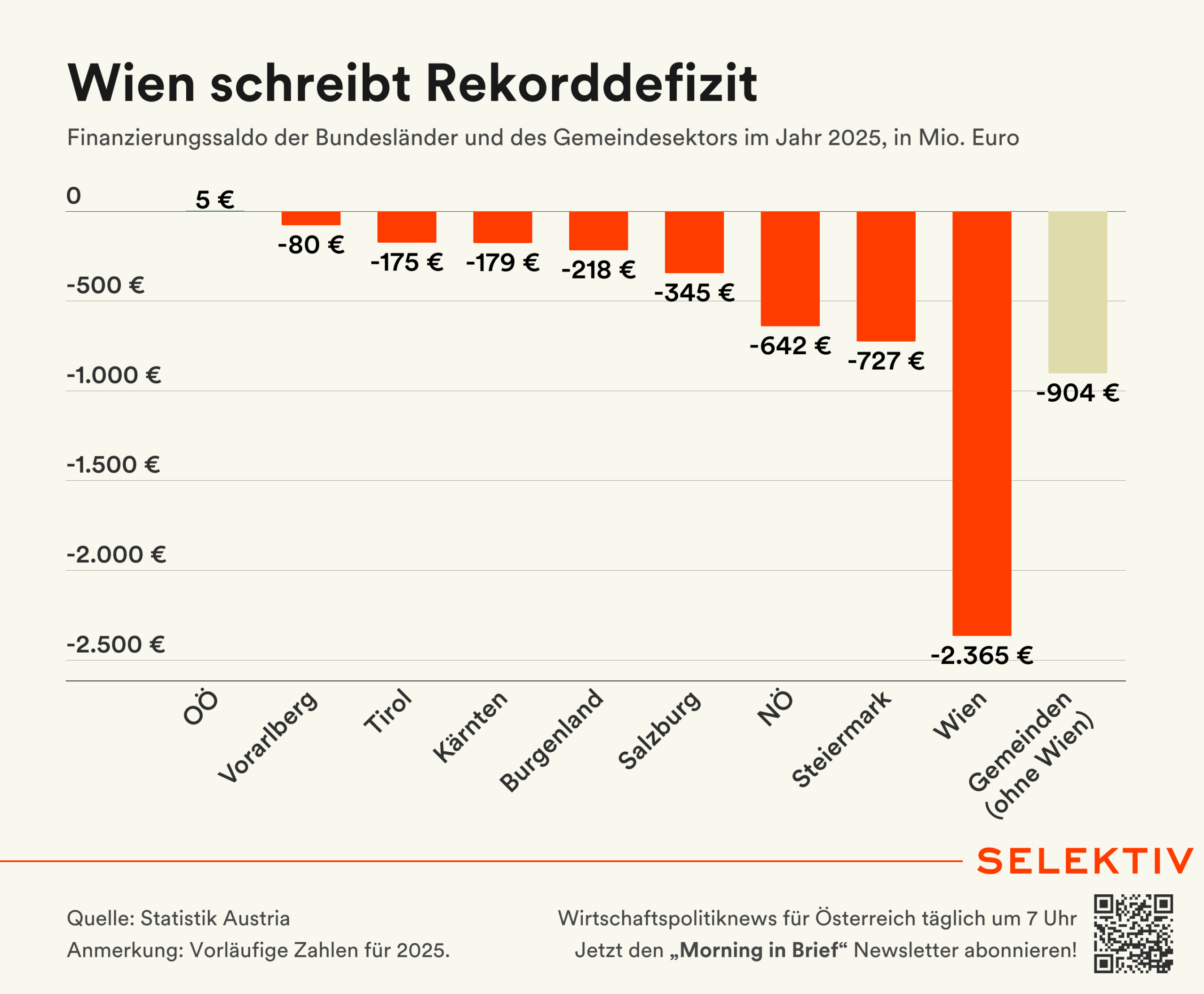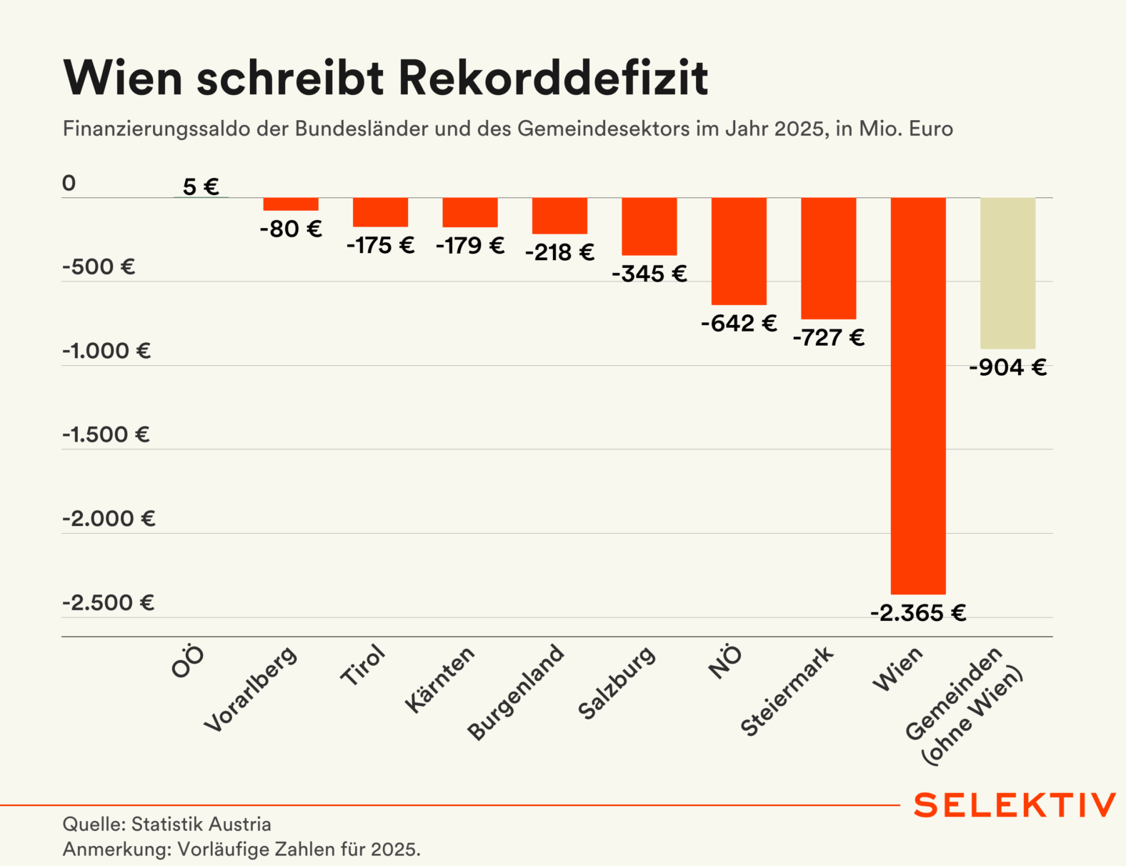 💡 Wien schreibt Rekorddefizit von 2,365 Mrd. Euro. Die Bundeshauptstadt hat 2025 mit Abstand das höchste Defizit unter allen Bundesländern und Gemeinden verbucht. Laut vorläufigen Zahlen von Statistik Austria lag der Finanzierungssaldo Wiens bei minus 2,365 Mrd. Euro – ein neuer Rekordwert (2024: -1,803 Mrd. Euro). Zum Vergleich: Die Steiermark folgte mit minus 727 Mio. Euro, Niederösterreich mit minus 642 Mio. Euro. Oberösterreich erzielte als einziges Bundesland ein kleines Plus von 5 Mio. Euro. Die Gemeinden (ohne Wien) verzeichneten insgesamt ein Defizit von 904 Mio. Euro und verbesserten damit ihr Saldo im Vergleich zu 2024 um rund 300 Mio. Euro. [Quelle: Statistik Austria | Grafik von Christoph Hofer]