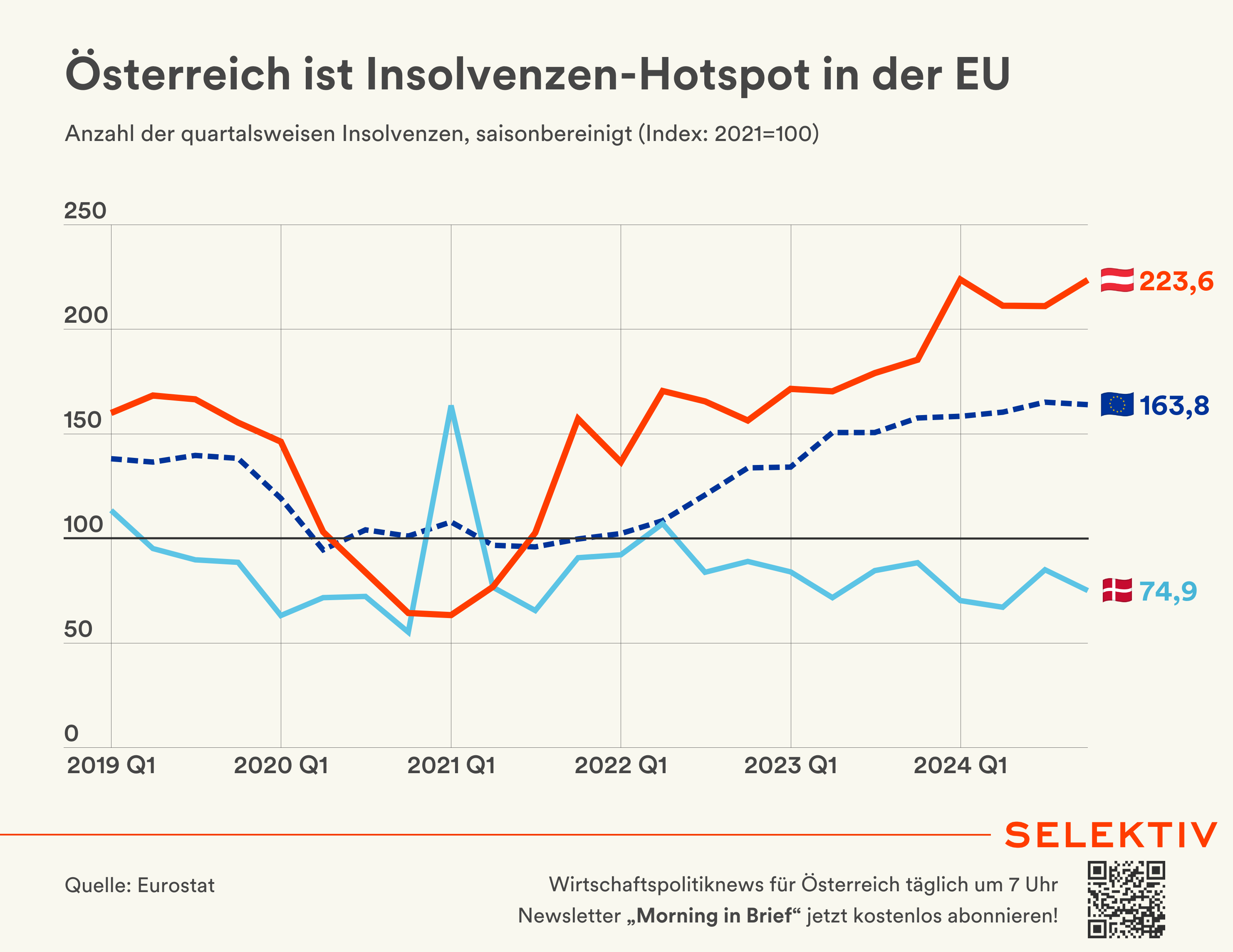 Grafik (von Christoph Hofer): Österreich verzeichnet in den letzten Jahren einen der höchsten Anstiege an Insolvenzen in der Europäischen Union. Lediglich Ungarn, die Niederlande, Frankreich und Griechenland zeigen seit 2021 eine dynamischere Insolvenzentwicklung. In Dänemark fiel die Insolvenzentwicklung innerhalb der EU am positivsten aus. Auch 2025 droht Österreich ein weiteres Insolvenzrekordjahr. Im ersten Quartal wurden bereits 1.134 Unternehmensinsolvenzen eröffnet, ein Plus von 3,94 Prozent gegenüber dem Vergleichszeitraum im Rekord-Pleite jahr 2024. Besonders betroffen waren zuletzt Unternehmen in der Immobilienbranche. [Quelle: Eurostat, dieSubstanz.at, AKV]