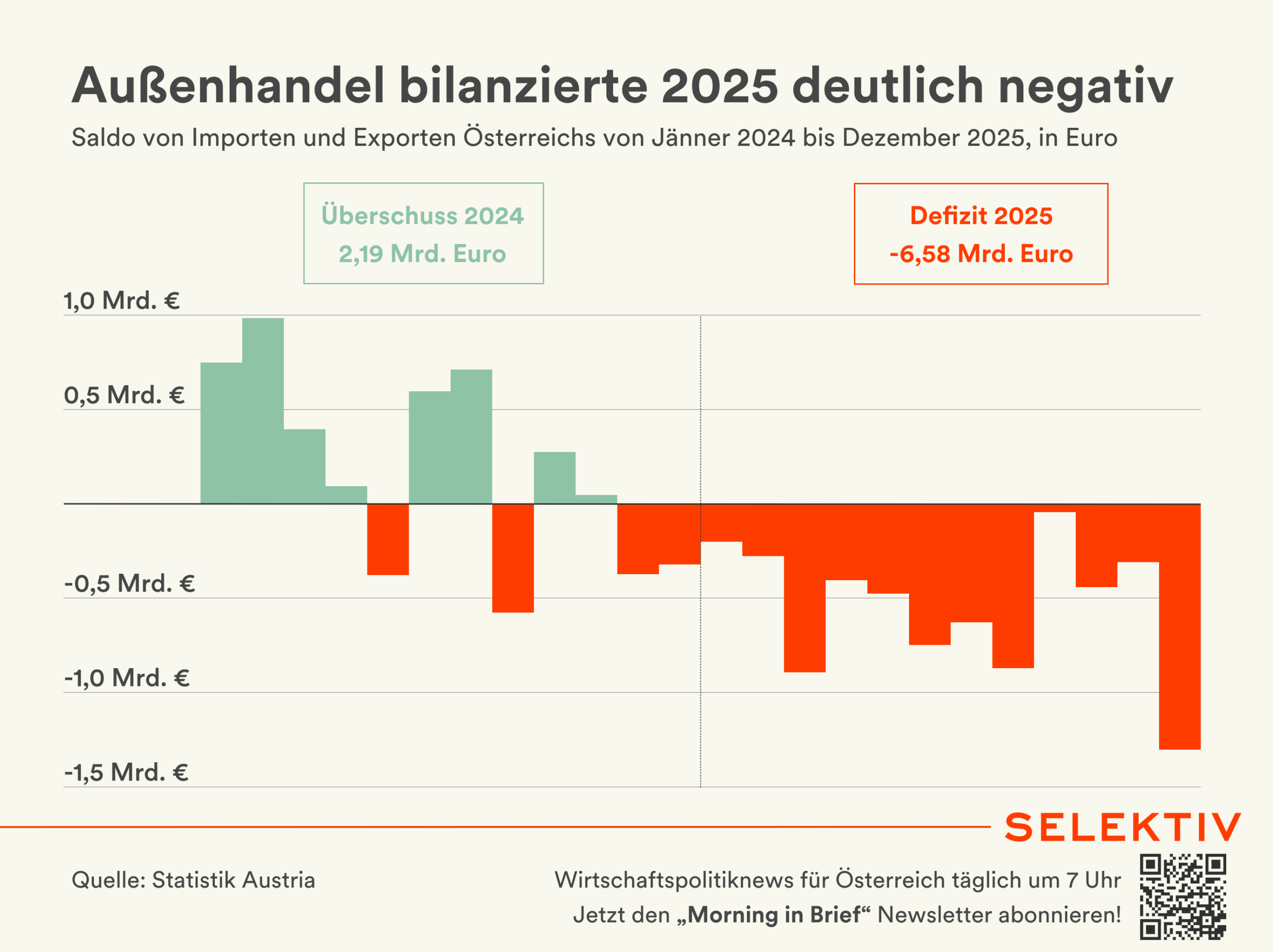 💡 Größtes Handelsbilanzdefizit seit 13 Jahren. Im Jahr 2025 sind Österreichs Importe um 4,1 % auf 196,72 Mrd. Euro gestiegen, während die Exporte um 0,5 % auf 190,14 Mrd. Euro gesunken sind. Insgesamt ergibt sich ein Handelsbilanzdefizit von 6,58 Mrd. Euro, das tiefste Defizit seit 2012. Jedes Monat wies im Vorjahr eine negative Handelsbilanz auf. Österreichs Außenhandelsbilanz ist im langjährigen Trend negativ, nur in 3 von 30 Jahren konnte ein Überschuss erzielt werden – jener aus dem Jahr 2024 war mit 2,19 Mrd. Euro der höchste. Deutschland war auch im Vorjahr der wichtigste Handelspartner Österreichs. Die Importe aus Deutschland stiegen um 4,1 %, während die Exporte um 1,2 % sanken. Zweitwichtigster Exportmarkt waren die USA, hier sind die Exporte im Vorjahr jedoch um 20 % gefallen. Zweitwichtigster Importmarkt war China, hier stiegen die Importe um 14 %. Für Wirtschaftsminister Wolfgang Hattmannsdorfer zeigt die negative Handelsbilanz, dass die österreichische Wettbewerbsfähigkeit „massiv unter Druck steht“. [Quellen: Statistik Austria, Pressekonferenz | Grafik von Stephan Frank]