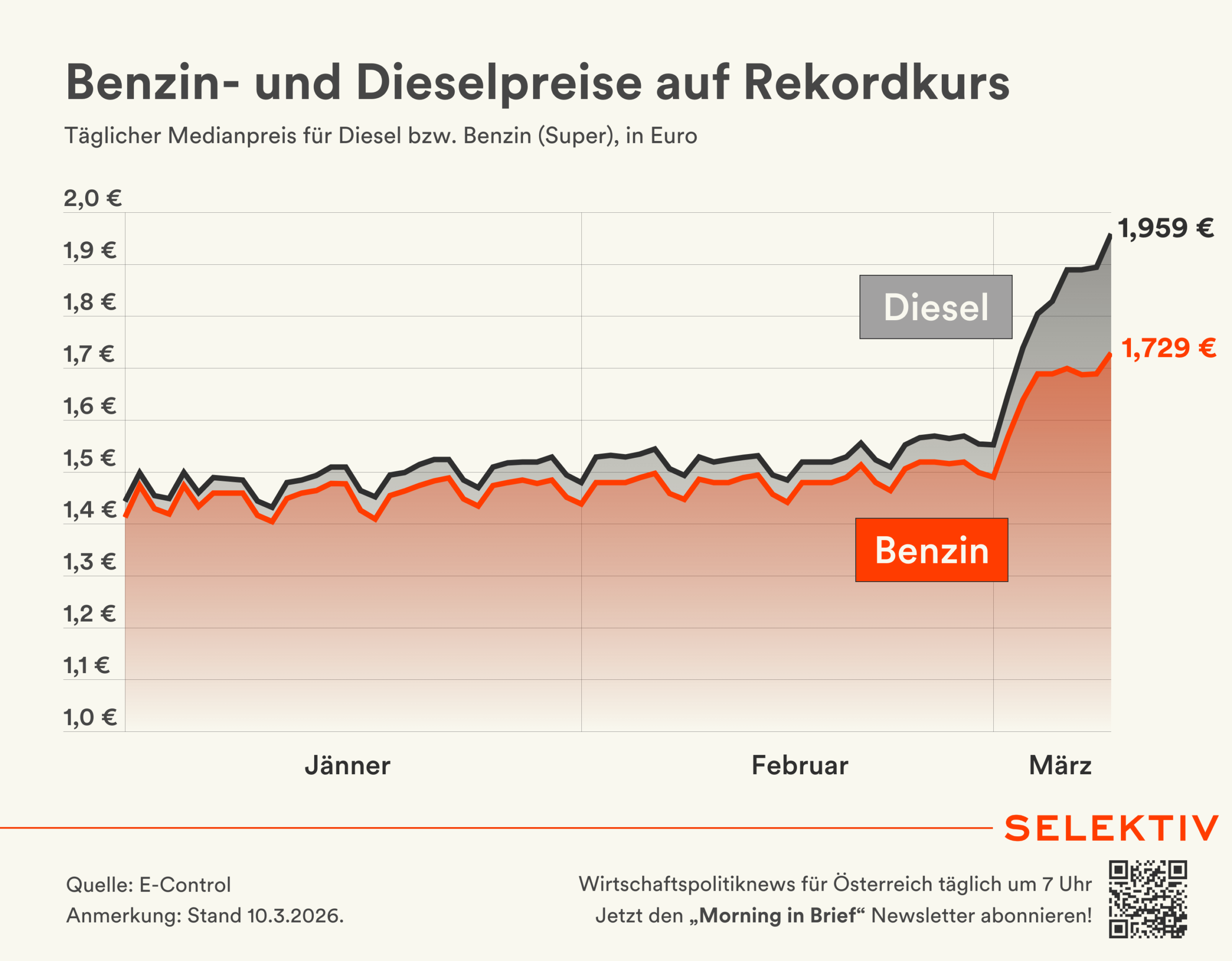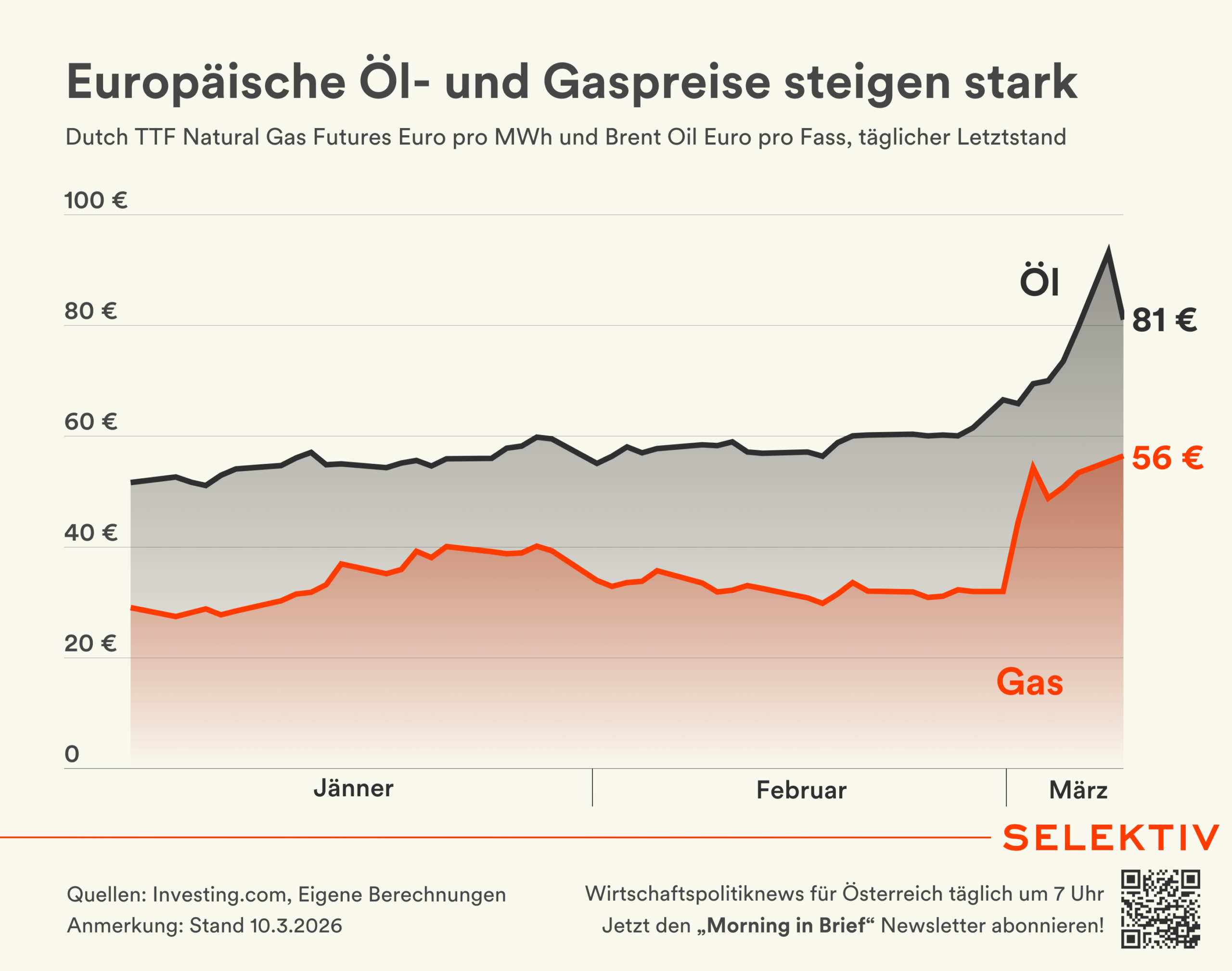🇦🇹🌐 Gas- und Spritpreise weiter gestiegen – Regierung plant Eingriff. Nach einem Anstieg auf knapp 120 Dollar pro Fass hat sich der Ölpreis (Brent) heute Früh mit rund 95 Dollar (rund 81 Euro) wieder unter der 100-Dollar-Marke eingependelt. Der Gaspreis (Dutch TTF) ist weiter auf 56 Euro pro MWh gestiegen. Die Literpreise für Benzin (1,729 Euro) und Diesel (1,959 Euro) sind ebenfalls weiter gestiegen. Christian Stocker spricht sich daher für eine „temporäre Senkung der Steuern auf Sprit“ aus, der Staat dürfe „nicht zum Krisenprofiteur werden“. Vizekanzler Andreas Babler präferiert hingegen einen Preisdeckel. Welches Modell am treffsichersten und effektivsten sei, wird derzeit in der Bundesregierung „intensiv geprüft und verhandelt“, so Bundeskanzler Stocker. Die Finanzminister der G7 haben sich gestern auf „notwendige Maßnahmen“ zur Absicherung der globalen Energieversorgung verständigt, die strategischen Ölreserven werden vorerst aber nicht freigegeben. Zugleich haben Ungarn und Kroatien eine Deckelung der Treibstoffpreise angekündigt. [Quellen: Ölpreis, Gaspreis, Spritpreis, Stocker auf X, Reuters (G7), Orbán auf Facebook, Plenković auf X | Reaktionen: SPÖ, FPÖ (Hammerl), FPÖ (Kickl), ARBÖ, NÖ-Landesreg. | Grafiken: Entwicklung Öl- und Gaspreis, Entwicklung Benzin- und Dieselpreis]