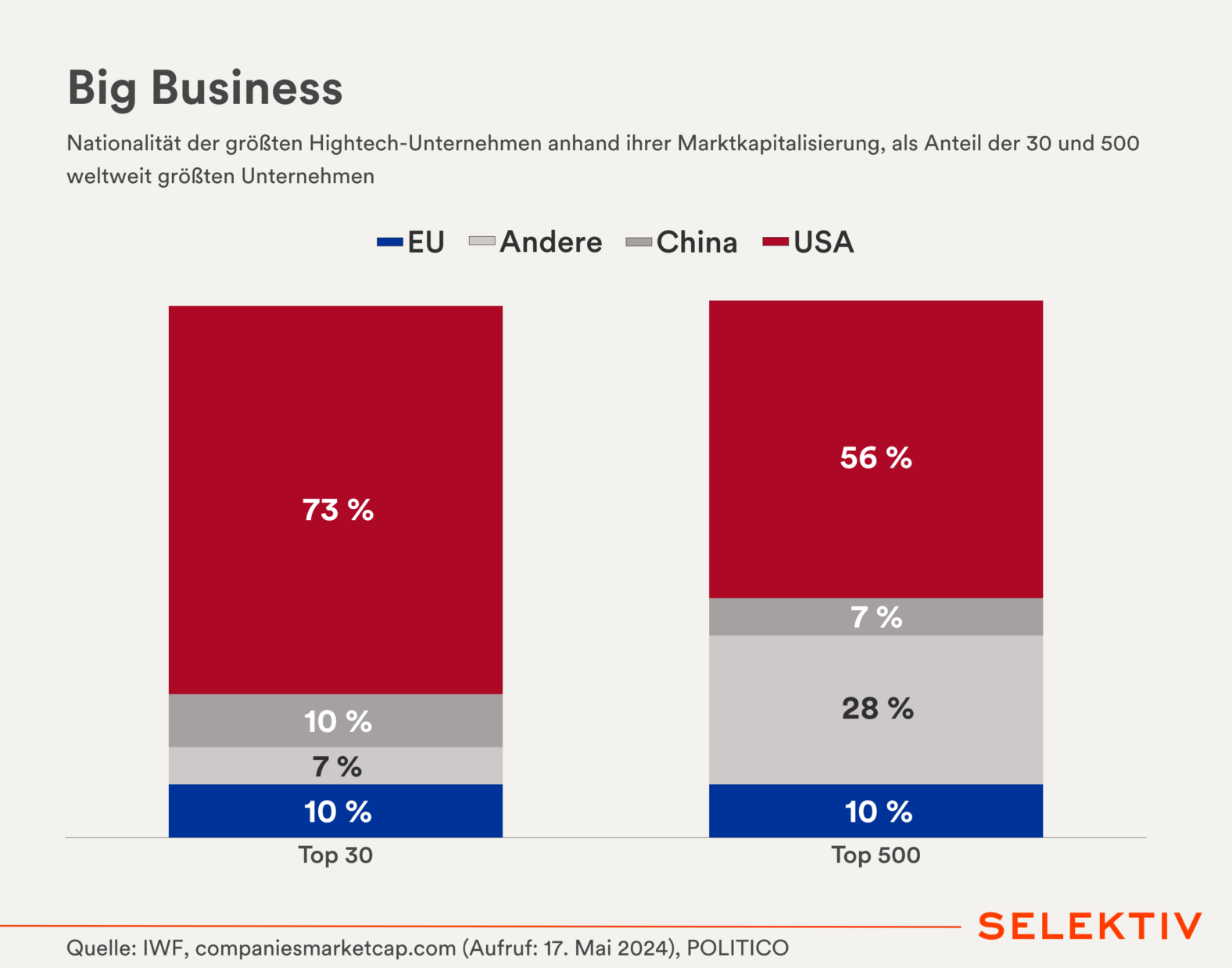 Grafik (von Christoph Hofer): 73 Prozent der Top 30 Hightech-Unternehmen der Welt stammen aus den USA – nur 10 Prozent aus der EU. In den letzten 50 Jahren wurde kein einziges EU-Unternehmen gegründet, welches die 100 Milliarden Euro Schallmauer durchbrach. Auch bei den Top 500 Hightech-Unternehmen stellen die USA weiterhin die Mehrheit.