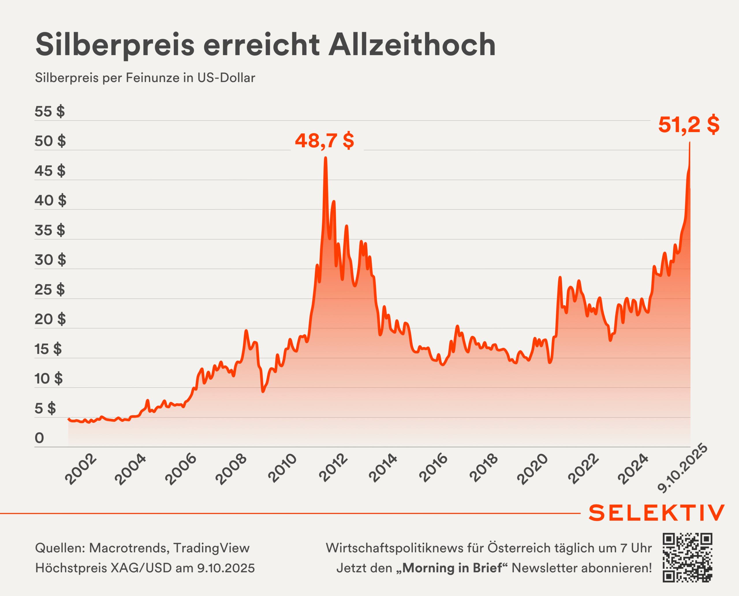 🌐 Silber erreicht neues Allzeithoch. Silber wurde am Donnerstag mit 51,23 US-Dollar pro Feinunze gehandelt und erreichte damit sein bisheriges Allzeithoch. Seit Jahresbeginn gewann das Edelmetall über 70 % an Wert, Gold dagegen nur um etwas mehr als 50 %. Im Jahr 2011 kratzte Silber bereits einmal an der 50-Dollar-Marke und auch 1980 erreichte es ein zwischenzeitliches Hoch. Zuletzt trieb die starke Nachfrage aus der Industrie den Preis des Rohstoffs, der vor allem für die Produktion von Autos, Windturbinen und Photovoltaik verwendet wird. [Quellen: Reuters, Tradingview | Grafik: Silberpreis erreicht Allzeithoch]