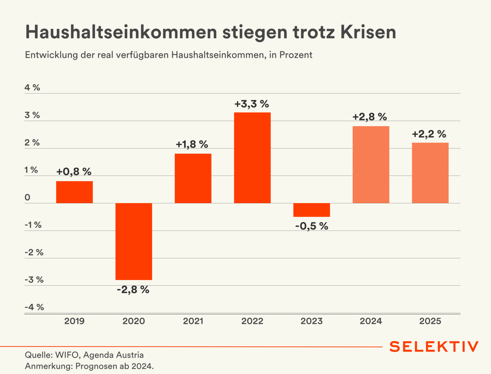Grafik: Trotz Corona-Krise, Ukraine-Krieg und Rekordteuerung wuchs das real verfügbare Einkommen der heimischen Haushalte leicht. Umfassende staatliche Hilfsprogramme und starke Lohnerhöhungen federten die Krisenfolgen ab. Für 2024 und 2025 rechnet das WIFO mit spürbar steigenden Haushaltseinkommen.
