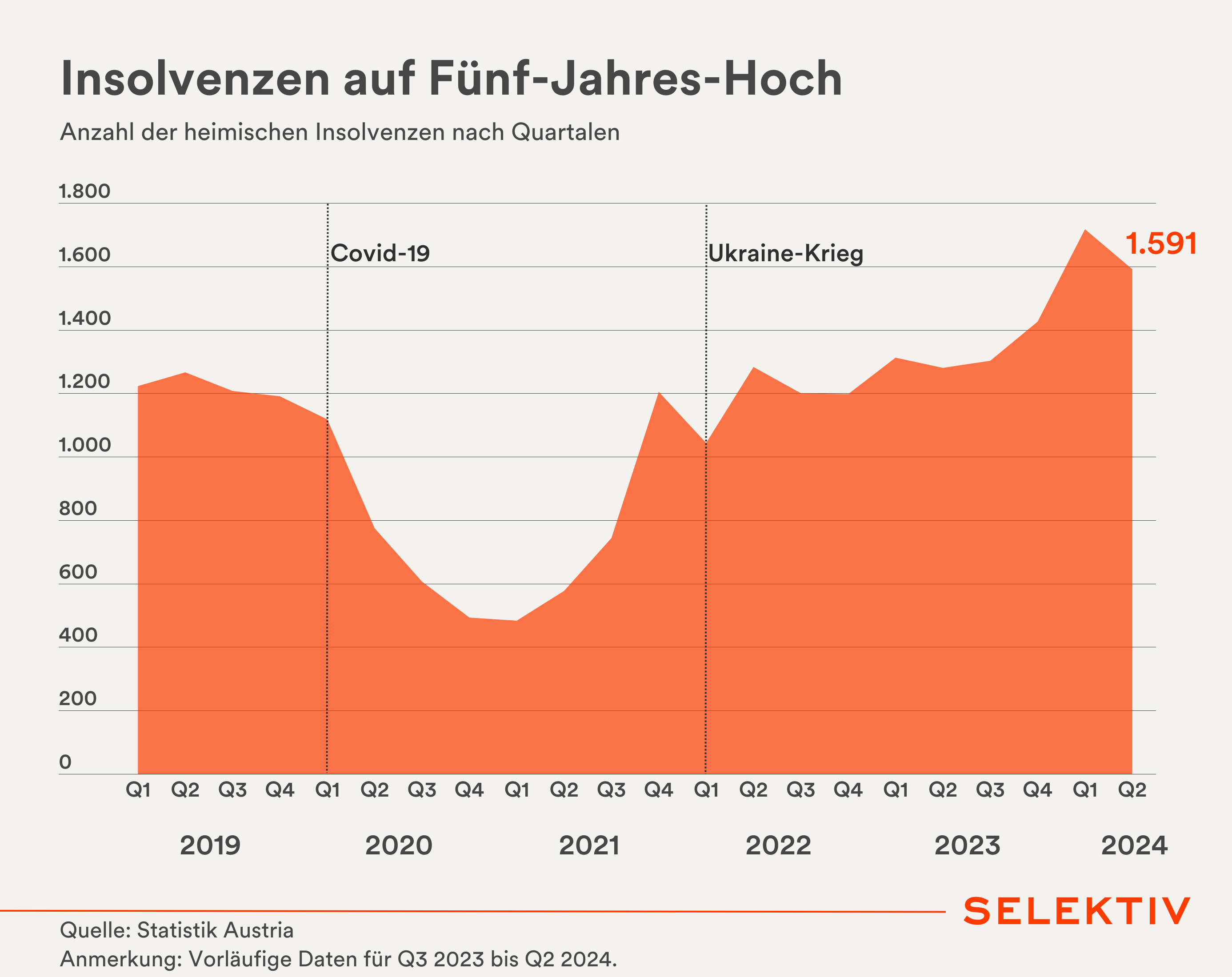 Insolvenzen. Die Zahl der Firmeninsolvenzen lag in Österreich im zweiten Quartal bei 1.591 – das ist im Jahresvergleich fast ein Viertel mehr, im Vergleich zum Vorquartal allerdings ein Rückgang um 7,3 Prozent. Im ersten Halbjahr gab es 3.308 Insolvenzen – um 28 Prozent mehr als im Vorjahreszeitraum. Betroffen sind vor allem die Bereiche Finanz/Dienstleistungen, Bau, Handel und Beherbergung/Gastronomie. In Deutschland stiegen die Insolvenzen laut dem Institut für Wirtschaftsforschung Halle (IWH) zuletzt in der Industrie auffällig an. Nach 100 Industriebetrieben im Juni meldeten im Juli 145 Insolvenz an. [Quellen: Statistik Austria; IWH]