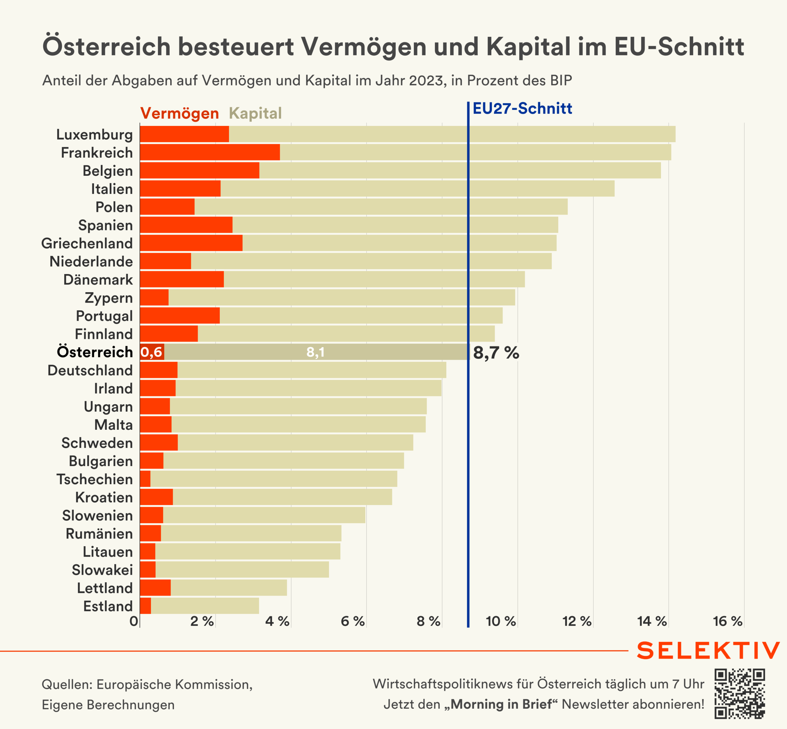 💡 Österreich bei Vermögens- und Kapitalbesteuerung im EU-Schnitt. 2023 machten Abgaben auf Vermögen – v. a. Grund- und Grunderwerbsteuer – rund 0,6 % des BIP aus (Platz 20 in der EU). Steuern auf Kapital – insbesondere Kapitalertragsteuer und Körperschaftsteuer – brachten 8,1 % des BIP ein (Platz 10 in der EU). Zusammengezählt ergibt sich ein Anteil von 8,73 % des BIP – leicht über dem EU-Durchschnitt von 8,68 %. [Quelle: Europäische Kommission | Grafik von Christoph Hofer]