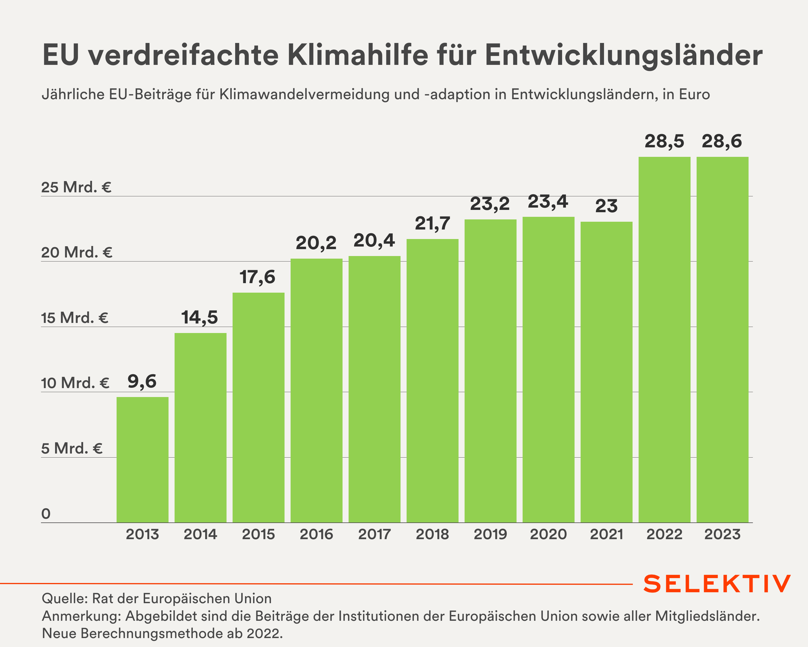Grafik (von Christoph Hofer): Seit 2013 verdreifachte die Europäische Union (EU-Institutionen & Mitgliedsländer) die zur Verfügung gestellten Mittel für Klimawandelvermeidung und –adaption in Entwicklungsländern. 2023 gab man 28,6 Milliarden Euro hierfür aus. Weitere 7,2 Milliarden Euro konnten hierdurch an privaten Mitteln mobilisiert werden. [Quelle: Rat der EU]