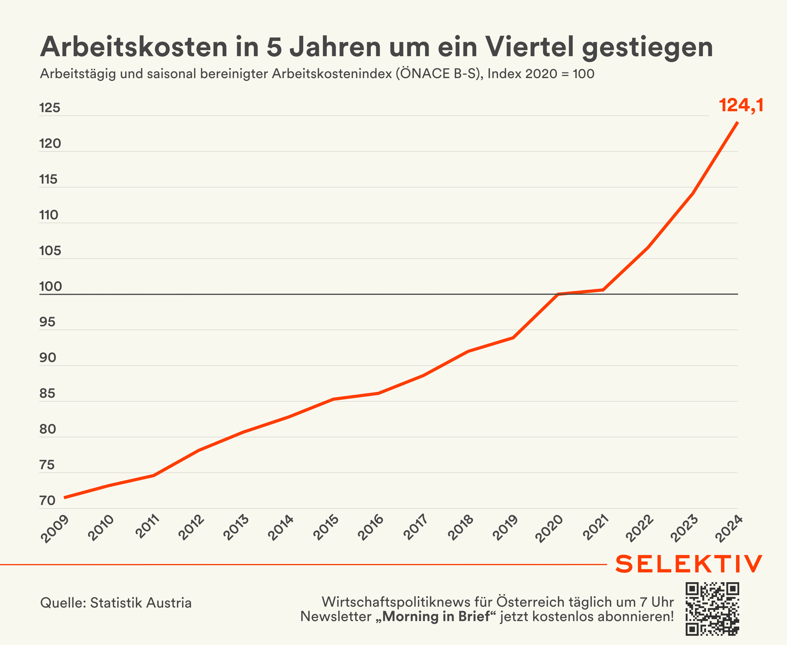 Grafik (von Stephan Frank): Der Anstieg der Arbeitskosten in Österreich setzte sich 2024 unvermittelt fort. Mittlerweile ist der österreichische Arbeitskostenindex seit 2019 um mehr als ein Viertel gestiegen und erreicht im Jahr 2024 den Indexwert von 124,1 (2020 = 100). Vor allem ab 2021 beschleunigte sich die Entwicklung deutlich. Der Arbeitskostenindex (AKI) misst vierteljährlich die Entwicklung der von Arbeitgebern je geleisteter Arbeitsstunde zu tragenden Kosten. [Quelle: Statistik Austria]