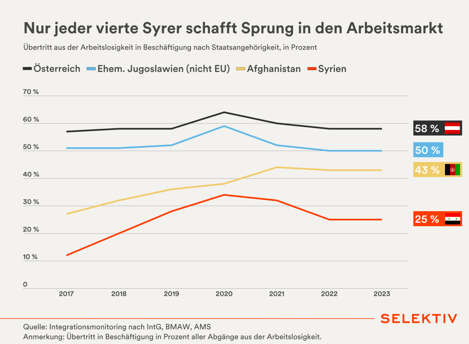 Grafik: Die Arbeitsmarktintegration von heimischen Flüchtlingen gestaltet sich weiterhin schwierig. Während im vergangenen Jahr 58 Prozent der Abgänge österreichischer Staatsbürger aus der Arbeitslosigkeit wieder in Beschäftigung führten, gelang dies nur 25 Prozent der Syrer (Männer: 28 Prozent, Frauen: 18 Prozent).