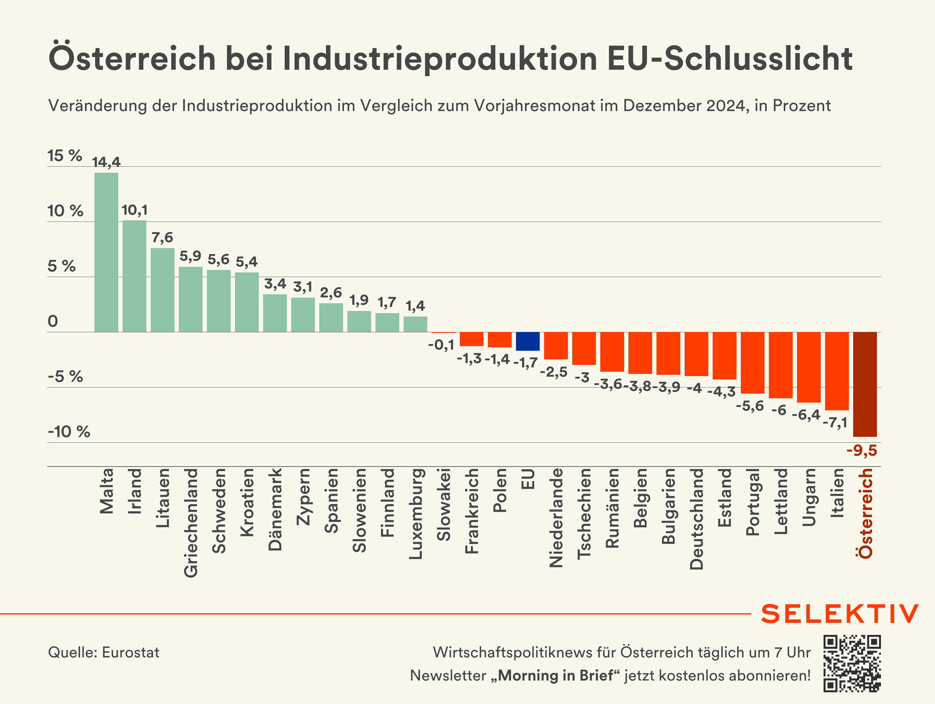 Grafik (von Christoph Hofer): Im Dezember 2024 sank die saisonbereinigte Industrieproduktion gegenüber November 2024 laut ersten Schätzungen im Euroraum um 1,1 Prozent und in der EU um 0,8 Prozent. Gegenüber Dezember 2023 sank die Industrieproduktion im Dezember 2024 im Euroraum um 2,0 Prozent und in der EU um 1,7 Prozent – Österreich ist hier mit einem Minus von 9,5 Prozent Schlusslicht, danach folgen Italien mit -7,1 Prozent und Ungarn mit -6,4 Prozent. [Quelle: Eurostat]